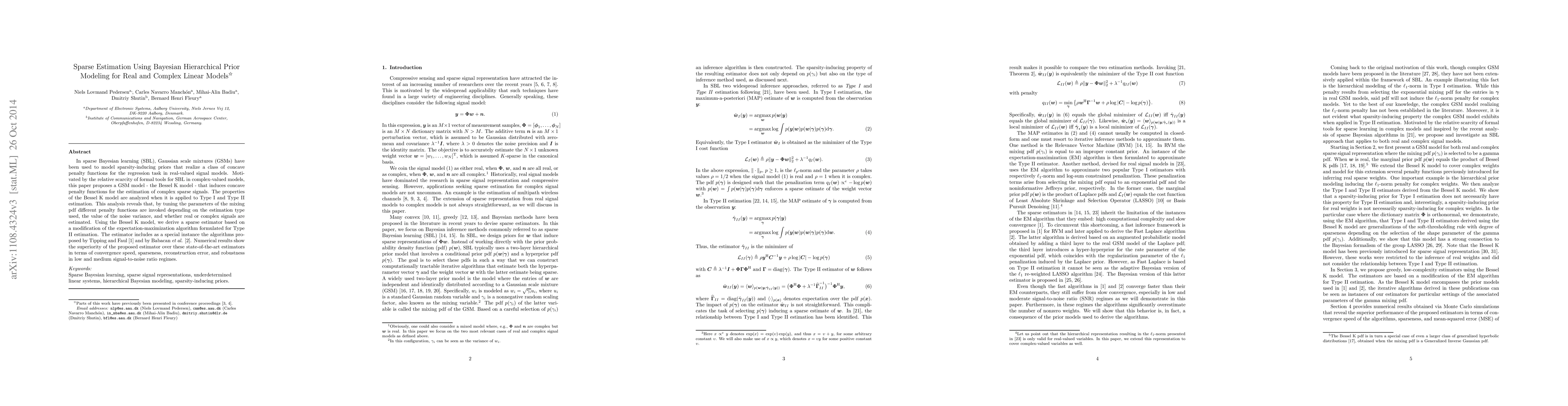 This paper introduces a Bayesian hierarchical prior model called Bessel K, which enables sparse estimation of complex signals with real-valued signal models. It shows the superiority of the proposed estimator over existing algorithms in terms of convergence speed, sparseness, reconstruction error, and robustness.