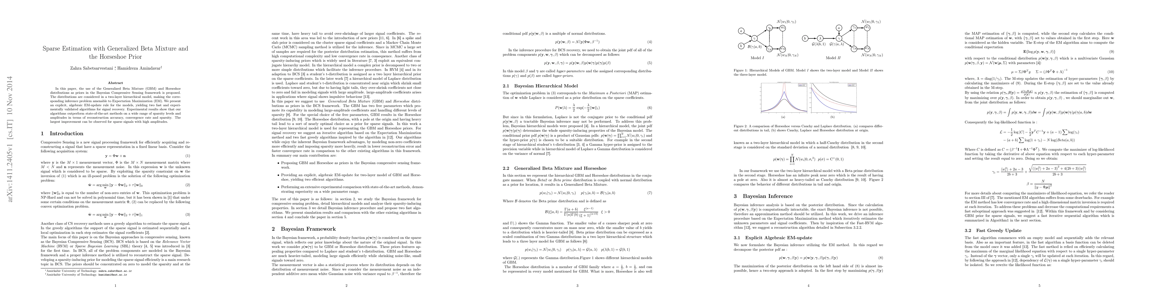In this paper, the use of the Generalized Beta Mixture (GBM) and Horseshoe distributions as priors in the Bayesian Compressive Sensing framework is proposed. The distributions are considered in a two-layer hierarchical model, making the corresponding inference problem amenable to Expectation Maximization (EM). We present an explicit, algebraic EM-update rule for the models, yielding two fast and experimentally validated algorithms for signal recovery. Experimental results show that our algorithms outperform state-of-the-art methods on a wide range of sparsity levels and amplitudes in terms of reconstruction accuracy, convergence rate and sparsity. The largest improvement can be observed for sparse signals with high amplitudes.