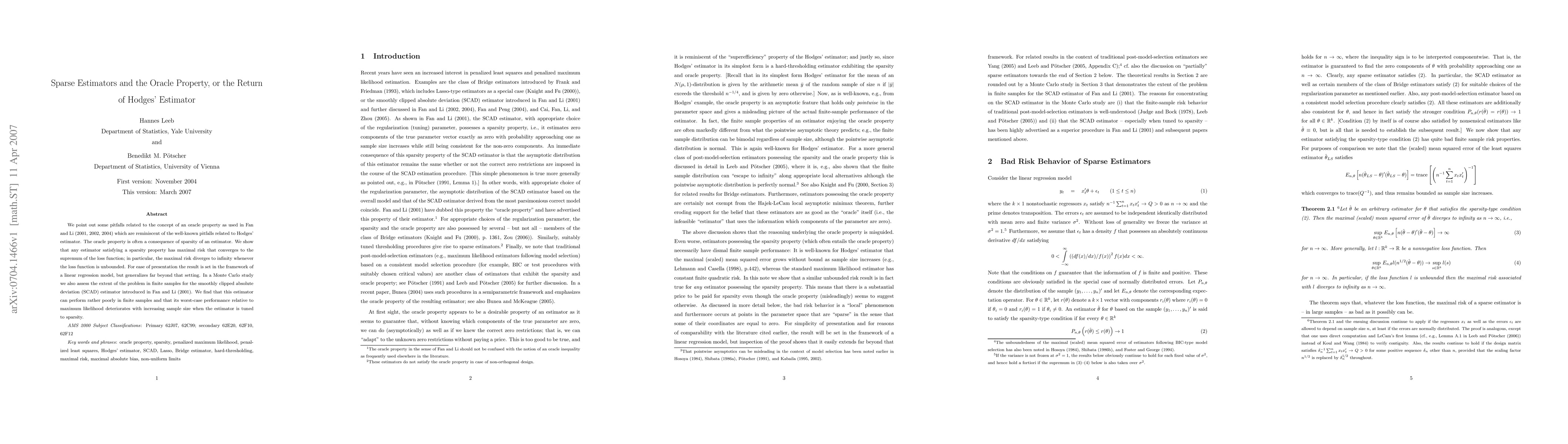 We point out some pitfalls related to the concept of an oracle property as used in Fan and Li (2001, 2002, 2004) which are reminiscent of the well-known pitfalls related to Hodges' estimator. The oracle property is often a consequence of sparsity of an estimator. We show that any estimator satisfying a sparsity property has maximal risk that converges to the supremum of the loss function; in particular, the maximal risk diverges to infinity whenever the loss function is unbounded. For ease of presentation the result is set in the framework of a linear regression model, but generalizes far beyond that setting. In a Monte Carlo study we also assess the extent of the problem in finite samples for the smoothly clipped absolute deviation (SCAD) estimator introduced in Fan and Li (2001). We find that this estimator can perform rather poorly in finite samples and that its worst-case performance relative to maximum likelihood deteriorates with increasing sample size when the estimator is tuned to sparsity.