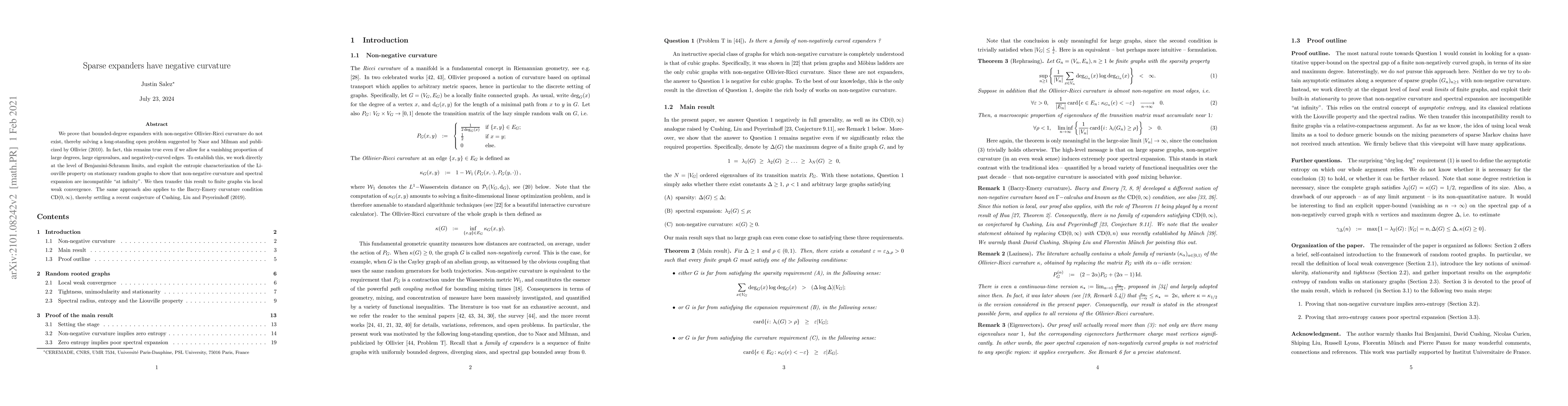 This paper proves that bounded-degree expanders cannot possess non-negative Ollivier-Ricci curvature, resolving a long-standing conjecture. The authors demonstrate this by showing that non-negative curvature and spectral expansion are incompatible at the level of Benjamini-Schramm limits, and extend this to finite graphs through local weak convergence.