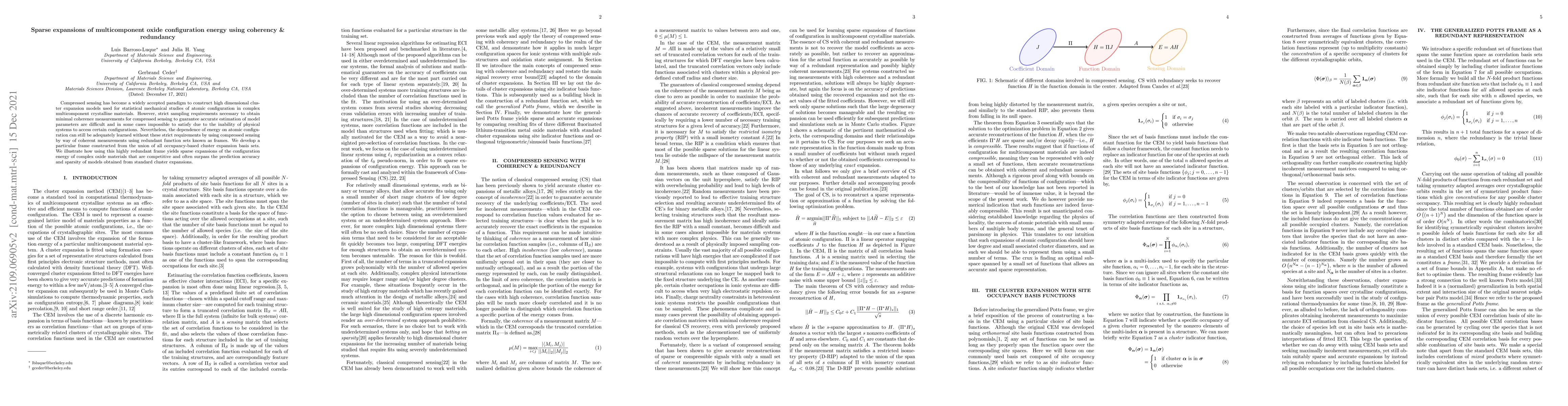 Compressed sensing has become a widely accepted paradigm to construct high dimensional cluster expansion models used for statistical mechanical studies of atomic configuration in complex multicomponent crystalline materials. However, strict sampling requirements necessary to obtain minimal coherence measurements for compressed sensing to guarantee accurate estimation of model parameters are difficult and in some cases impossible to satisfy due to the inability of physical systems to access certain configurations. Nevertheless, the dependence of energy on atomic configuration can still be adequately learned without these strict requirements by using compressed sensing by way of coherent measurements using redundant function sets known as frames. We develop a particular frame constructed from the union of all occupancy-based cluster expansion basis sets. We illustrate how using this highly redundant frame yields sparse expansions of the configuration energy of complex oxide materials that are competitive and often surpass the prediction accuracy and sparsity of models obtained from standard cluster expansions.