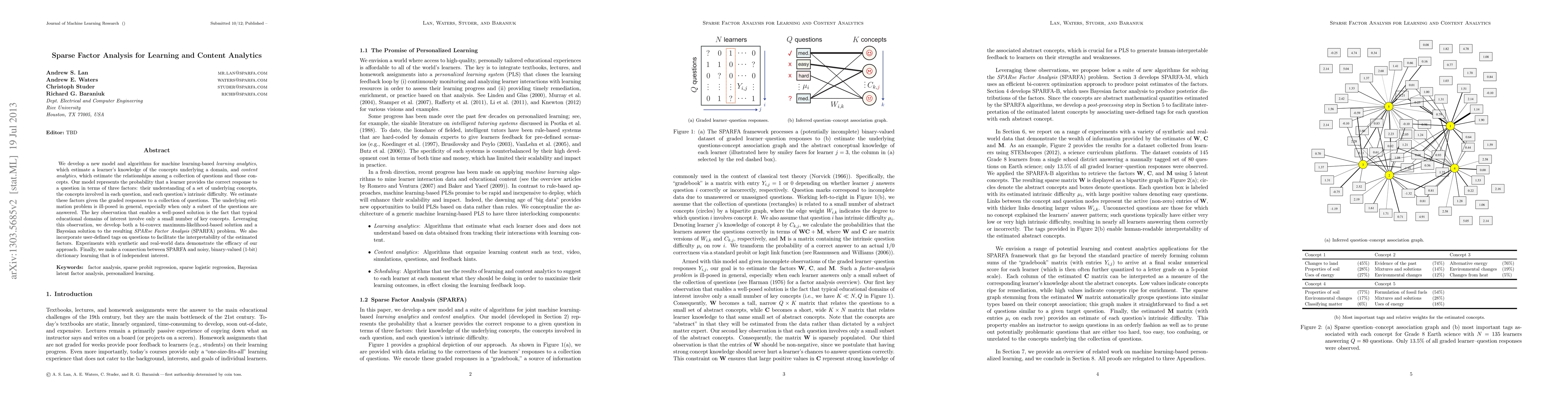 A new model called SPARse Factor Analysis (SPARFA) estimates learners' knowledge and content relationships in educational domains, improving learning analytics with accurate factor estimation and interpretability features.