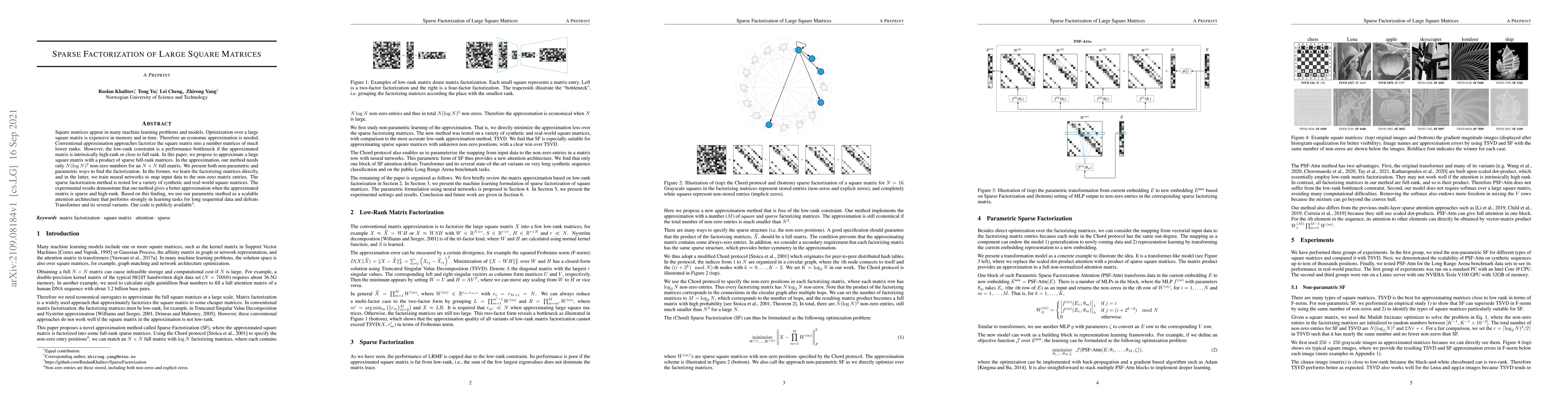 This paper proposes a sparse factorization method for approximating large square matrices, which uses a product of sparse full-rank matrices to achieve better approximations when the matrix is sparse and high-rank. The method is both non-parametric and parametric, showing strong performance in scalable attention architectures for long sequential data.