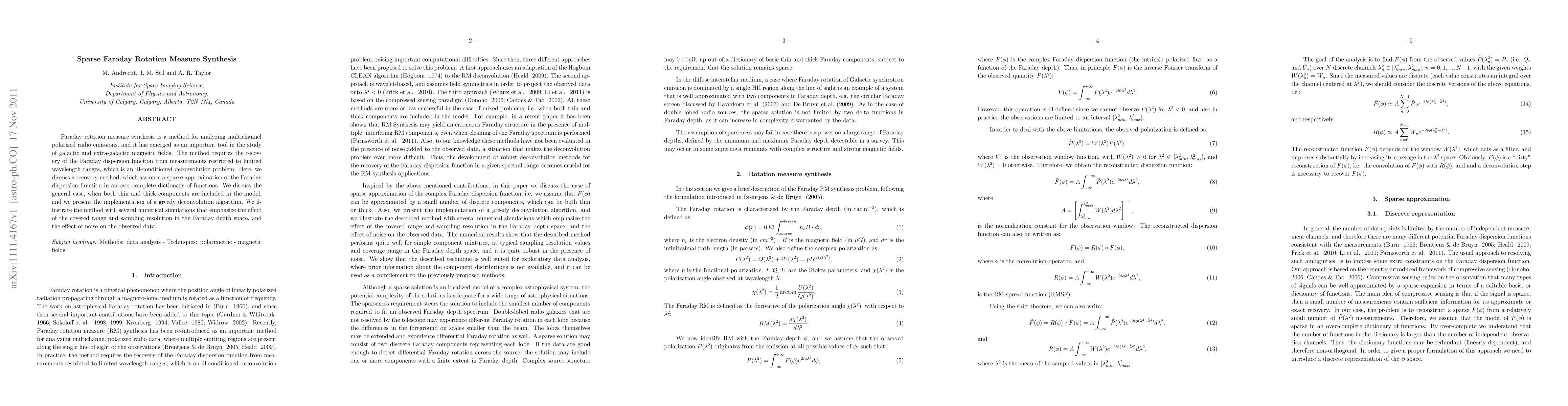 Faraday rotation measure synthesis is a method for analyzing multichannel polarized radio emissions, and it has emerged as an important tool in the study of galactic and extra-galactic magnetic fields. The method requires the recovery of the Faraday dispersion function from measurements restricted to limited wavelength ranges, which is an ill-conditioned deconvolution problem. Here, we discuss a recovery method, which assumes a sparse approximation of the Faraday dispersion function in an over-complete dictionary of functions. We discuss the general case, when both thin and thick components are included in the model, and we present the implementation of a greedy deconvolution algorithm. We illustrate the method with several numerical simulations that emphasize the effect of the covered range and sampling resolution in the Faraday depth space, and the effect of noise on the observed data.