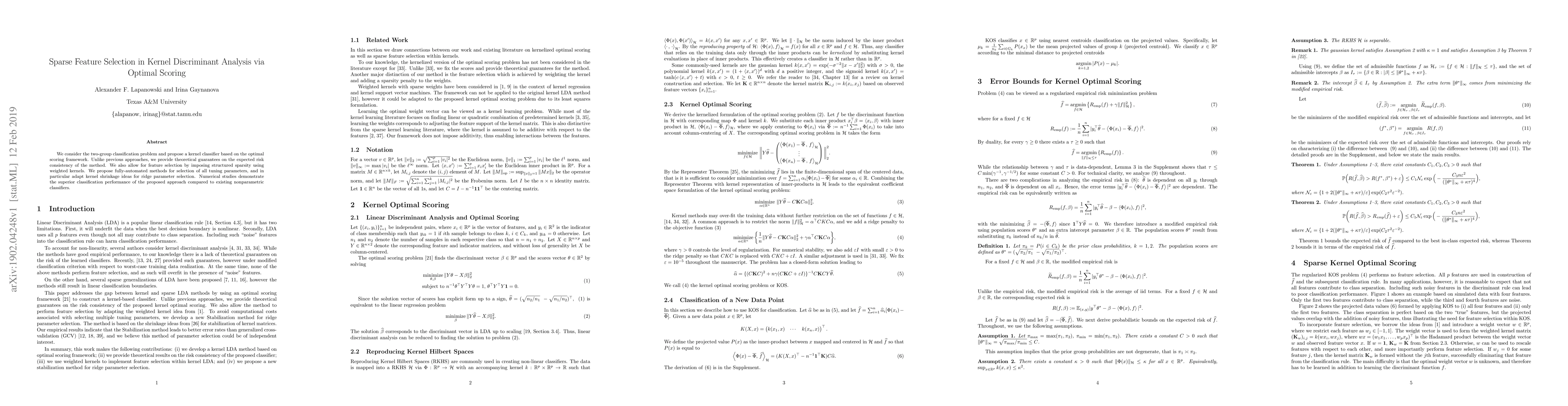 We consider the two-group classification problem and propose a kernel classifier based on the optimal scoring framework. Unlike previous approaches, we provide theoretical guarantees on the expected risk consistency of the method. We also allow for feature selection by imposing structured sparsity using weighted kernels. We propose fully-automated methods for selection of all tuning parameters, and in particular adapt kernel shrinkage ideas for ridge parameter selection. Numerical studies demonstrate the superior classification performance of the proposed approach compared to existing nonparametric classifiers.