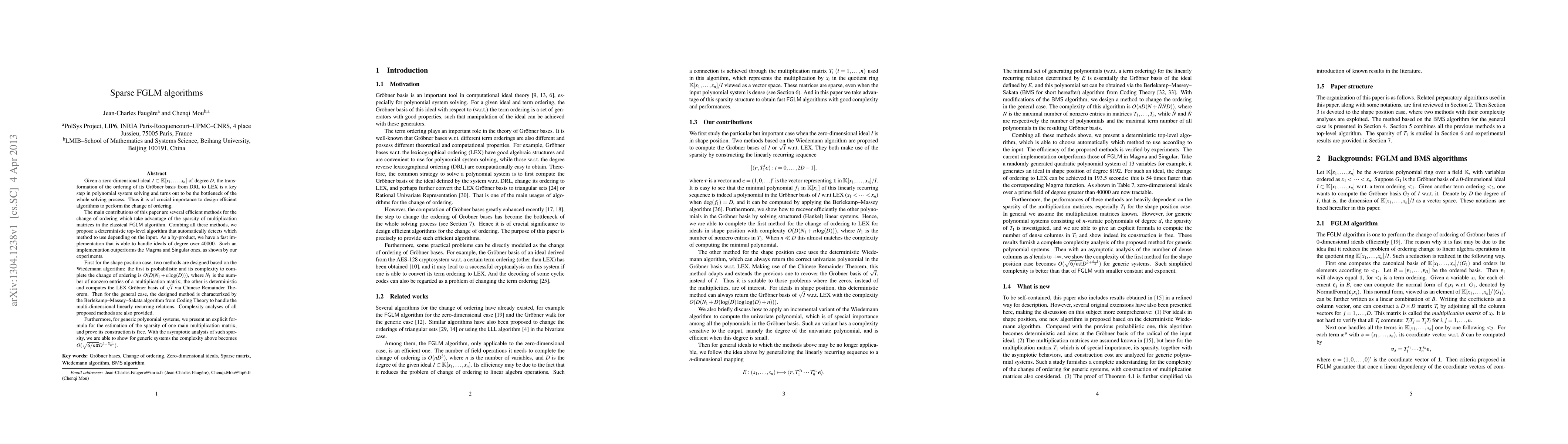 Given a zero-dimensional ideal I in K[x1,...,xn] of degree D, the transformation of the ordering of its Groebner basis from DRL to LEX is a key step in polynomial system solving and turns out to be the bottleneck of the whole solving process. Thus it is of crucial importance to design efficient algorithms to perform the change of ordering. The main contributions of this paper are several efficient methods for the change of ordering which take advantage of the sparsity of multiplication matrices in the classical FGLM algorithm. Combing all these methods, we propose a deterministic top-level algorithm that automatically detects which method to use depending on the input. As a by-product, we have a fast implementation that is able to handle ideals of degree over 40000. Such an implementation outperforms the Magma and Singular ones, as shown by our experiments. First for the shape position case, two methods are designed based on the Wiedemann algorithm: the first is probabilistic and its complexity to complete the change of ordering is O(D(N1+nlog(D))), where N1 is the number of nonzero entries of a multiplication matrix; the other is deterministic and computes the LEX Groebner basis of the radical of I via Chinese Remainder Theorem. Then for the general case, the designed method is characterized by the Berlekamp-Massey-Sakata algorithm from Coding Theory to handle the multi-dimensional linearly recurring relations. Complexity analyses of all proposed methods are also provided. Furthermore, for generic polynomial systems, we present an explicit formula for the estimation of the sparsity of one main multiplication matrix, and prove its construction is free. With the asymptotic analysis of such sparsity, we are able to show for generic systems the complexity above becomes $O(\sqrt{6/n \pi} D^{2+(n-1)/n}})$.