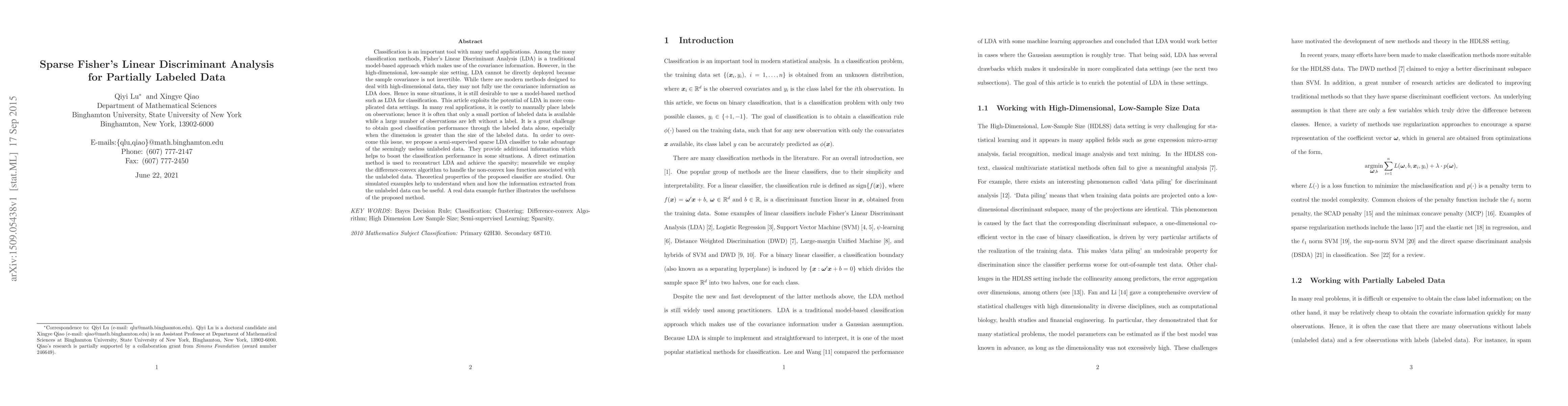 This paper proposes a semi-supervised sparse Fisher's Linear Discriminant Analysis (LDA) for classification in high-dimensional, low-sample size settings with partially labeled data. It utilizes unlabeled data to enhance classification performance and employs a difference-convex algorithm to handle the non-convex loss function, demonstrating improved results through simulations and real data examples.