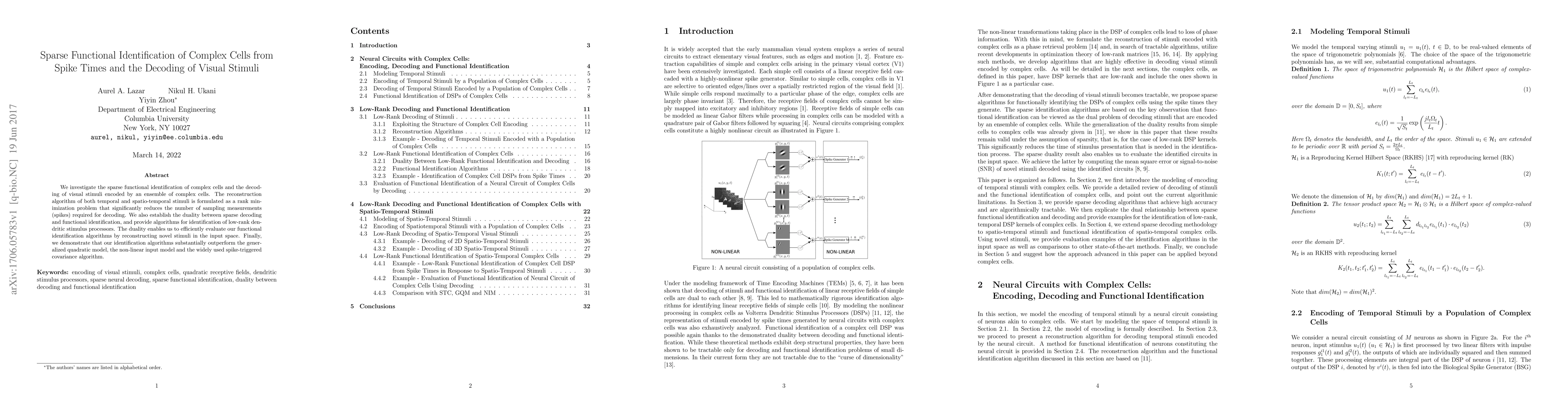 This paper proposes a sparse functional identification method for complex cells that reconstructs visual stimuli from spike times with minimal sampling. It establishes a duality between sparse decoding and functional identification, leading to efficient algorithms for low-rank dendritic stimulus processors and outperforming existing models in decoding accuracy.