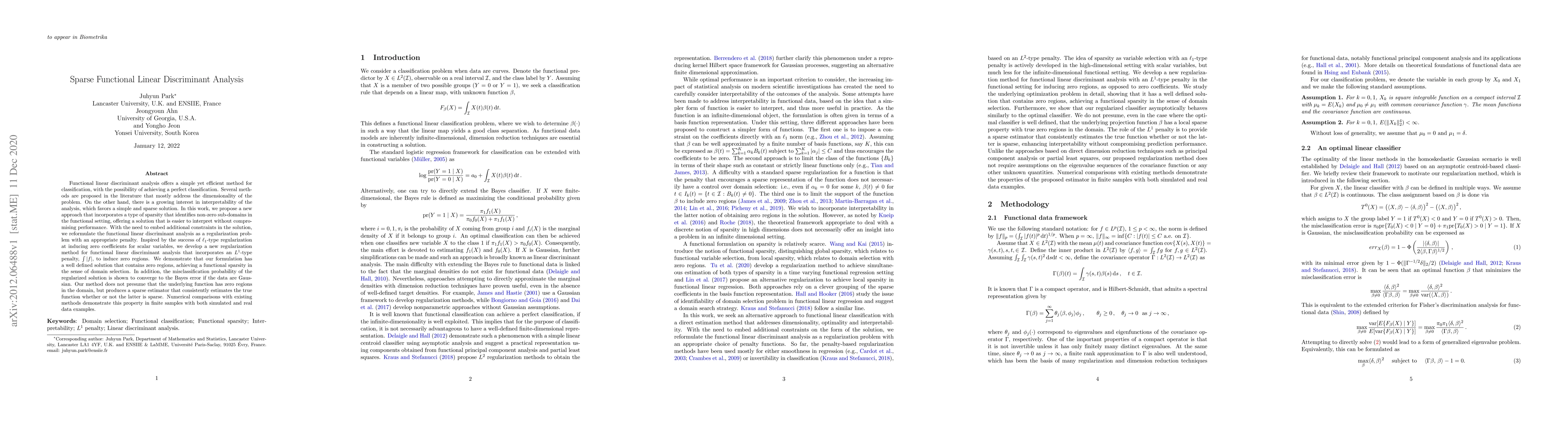 This paper proposes a sparse functional linear discriminant analysis method that incorporates an $L^1$-type penalty to identify non-zero sub-domains, enhancing interpretability without sacrificing classification performance. The method reformulates the analysis as a regularization problem and demonstrates that it achieves functional sparsity and converges to the Bayes error under Gaussian data conditions.
