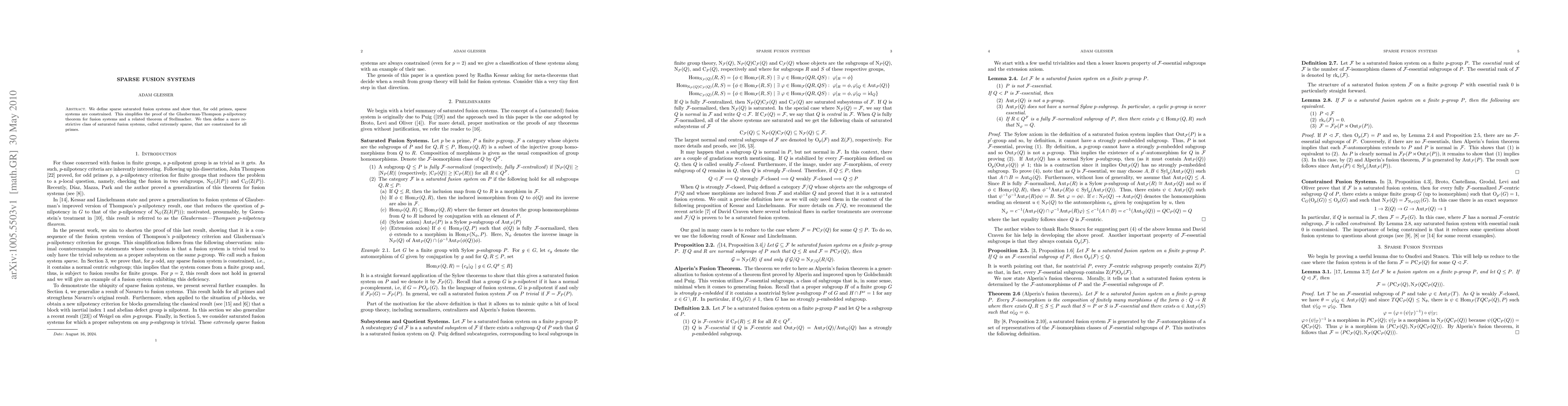 Sparse saturated fusion systems for odd primes exhibit constraints that simplify proofs of key theorems in fusion systems, notably the Glauberman-Thompson p-nilpotency theorem. Further, extremely sparse fusion systems, constrained for all primes, are introduced as a more restrictive class.