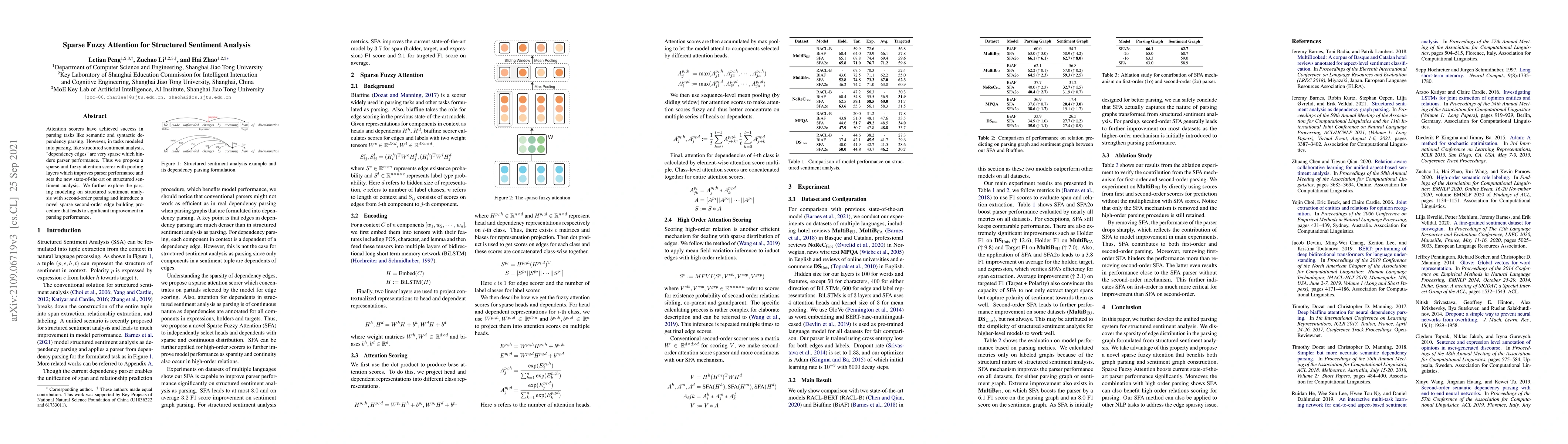 This paper proposes a sparse fuzzy attention scorer with pooling layers to improve structured sentiment analysis performance, especially where dependency edges are sparse. The approach also introduces a novel sparse second-order edge building procedure, achieving state-of-the-art results in the task.