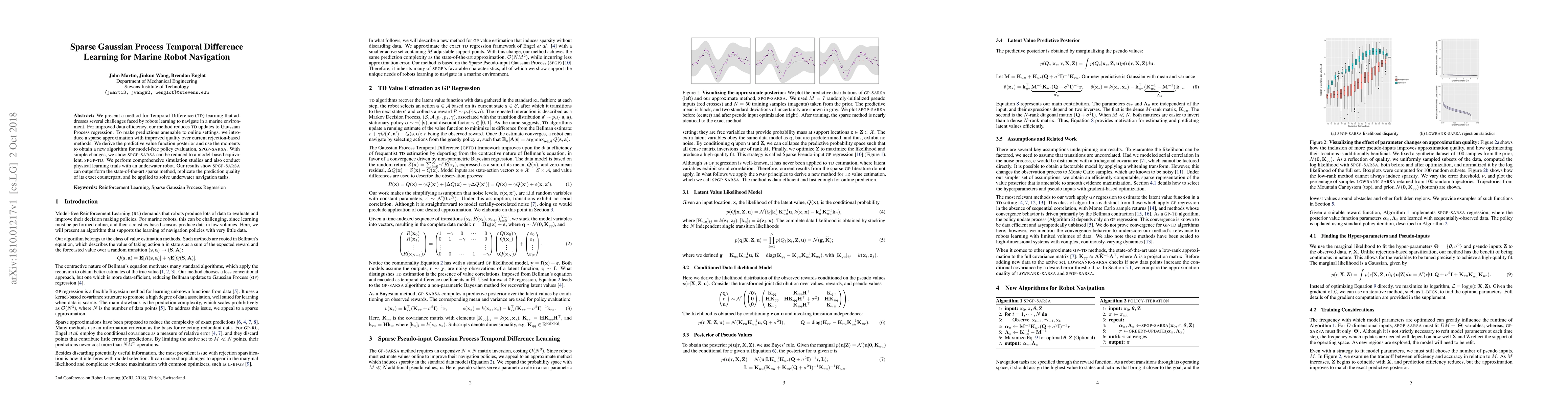 We present a method for Temporal Difference (TD) learning that addresses several challenges faced by robots learning to navigate in a marine environment. For improved data efficiency, our method reduces TD updates to Gaussian Process regression. To make predictions amenable to online settings, we introduce a sparse approximation with improved quality over current rejection-based sparse methods. We derive the predictive value function posterior and use the moments to obtain a new algorithm for model-free policy evaluation, SPGP-SARSA. With simple changes, we show SPGP-SARSA can be reduced to a model-based equivalent, SPGP-TD. We perform comprehensive simulation studies and also conduct physical learning trials with an underwater robot. Our results show SPGP-SARSA can outperform the state-of-the-art sparse method, replicate the prediction quality of its exact counterpart, and be applied to solve underwater navigation tasks.