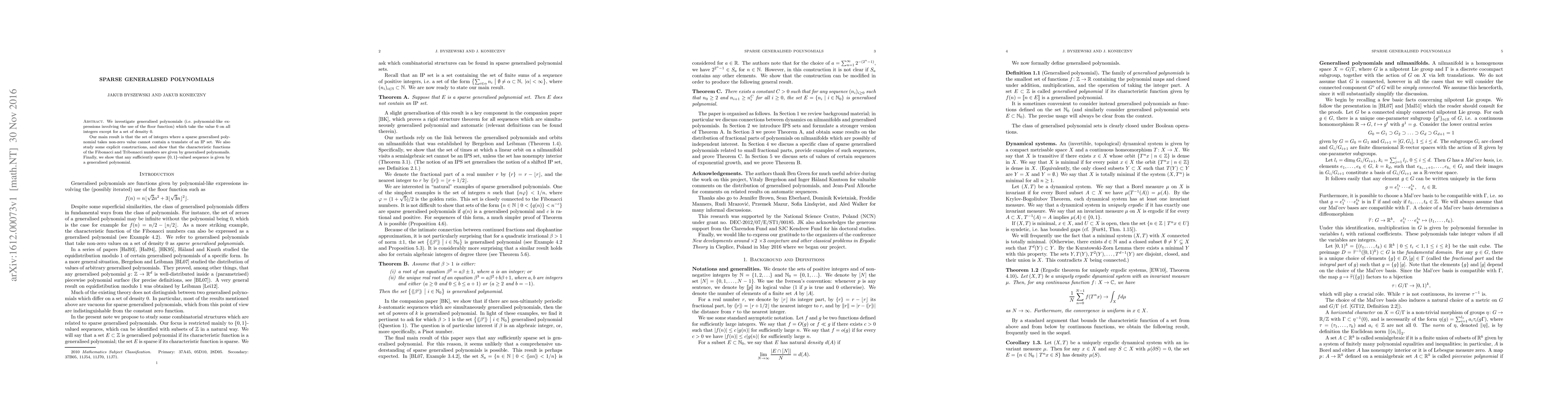 We investigate generalised polynomials (i.e. polynomial-like expressions involving the use of the floor function) which take the value $0$ on all integers except for a set of density $0$. Our main result is that the set of integers where a sparse generalised polynomial takes non-zero value cannot contain a translate of an IP set. We also study some explicit constructions, and show that the characteristic functions of the Fibonacci and Tribonacci numbers are given by generalised polynomails. Finally, we show that any sufficiently sparse $\{0,1\}$-valued sequence is given by a generalised polynomial. (This paper is essentially the first half of our earlier submission arXiv:1610.03900 [math.NT]. Because the material in arXiv:1610.03900 [math.NT] touches upon many different subjects, we believe it is preferable to split it into two independent papers.)