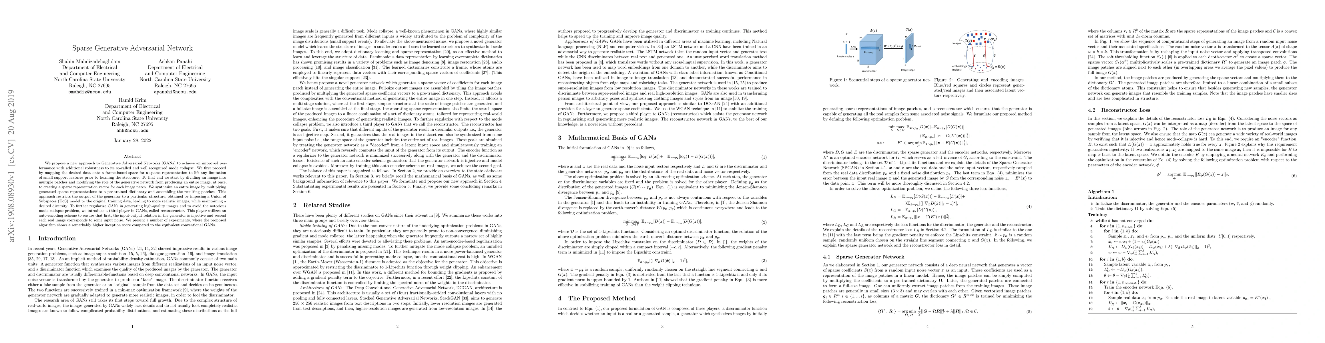 The paper proposes a Sparse Generative Adversarial Network (SPGAN) that improves GAN performance and robustness against mode collapse by first mapping data to a sparse representation space before learning structure. It modifies the generative network's role to produce sparse representation vectors for image patches, synthesizing images by multiplying these vectors with a pre-trained dictionary and assembling patches. A reconstructor is introduced as a third player to ensure generator injectivity and avoid mode collapse.