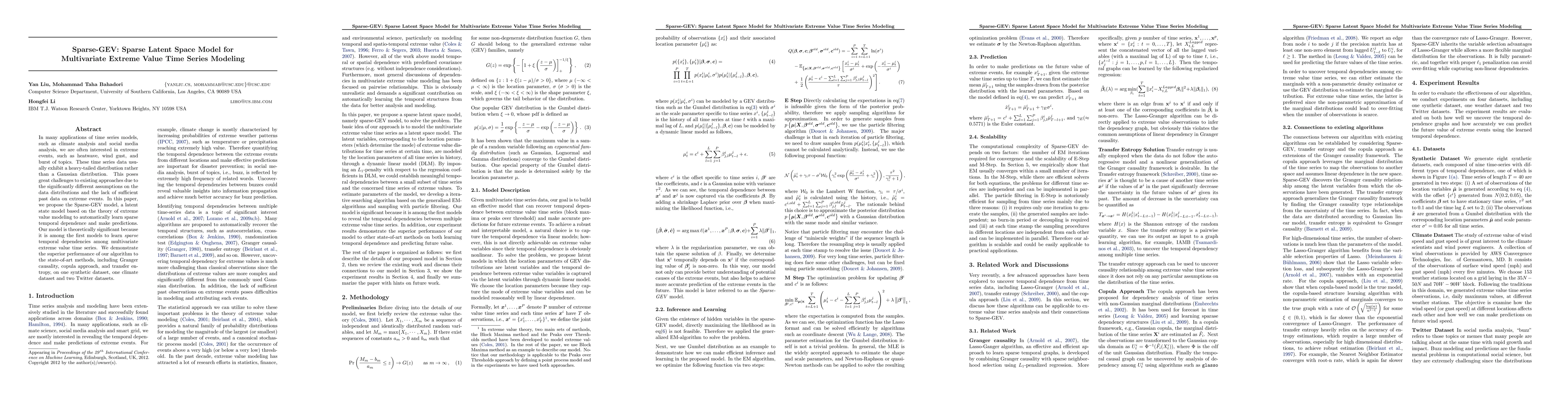In many applications of time series models, such as climate analysis and social media analysis, we are often interested in extreme events, such as heatwave, wind gust, and burst of topics. These time series data usually exhibit a heavy-tailed distribution rather than a Gaussian distribution. This poses great challenges to existing approaches due to the significantly different assumptions on the data distributions and the lack of sufficient past data on extreme events. In this paper, we propose the Sparse-GEV model, a latent state model based on the theory of extreme value modeling to automatically learn sparse temporal dependence and make predictions. Our model is theoretically significant because it is among the first models to learn sparse temporal dependencies among multivariate extreme value time series. We demonstrate the superior performance of our algorithm to the state-of-art methods, including Granger causality, copula approach, and transfer entropy, on one synthetic dataset, one climate dataset and two Twitter datasets.