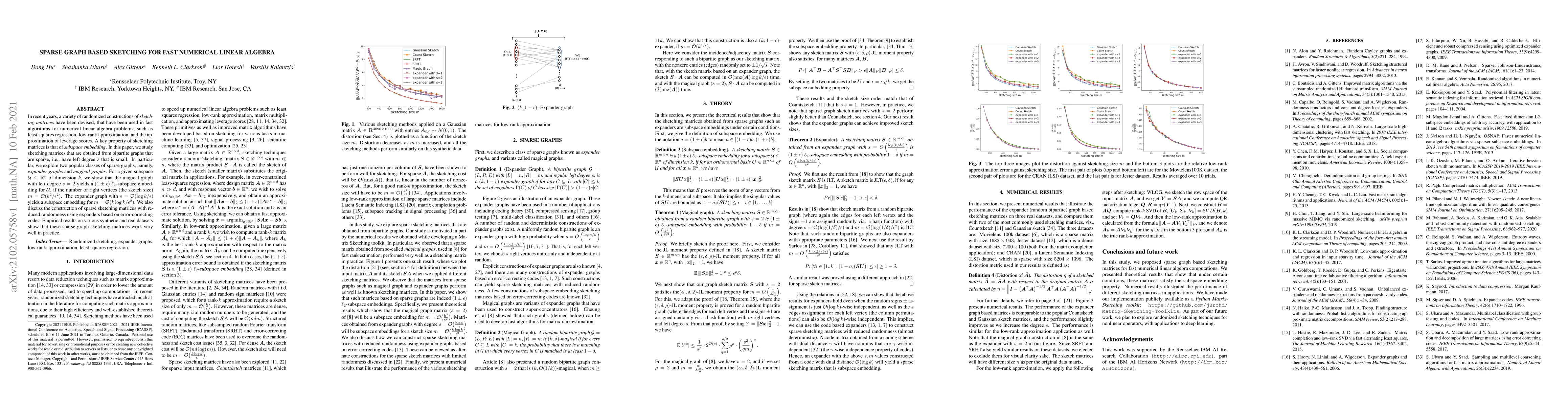 This paper investigates sparse graph-based sketching matrices derived from expander and magical graphs for efficient numerical linear algebra tasks. It demonstrates that magical graphs with left degree 2 provide $(1\pm \epsilon)$ ${\ell}_2$-subspace embeddings for subspaces of dimension $k$ with sketch size $m = \mathcal{O}({k^2}/{\epsilon^2})$, while expander graphs achieve similar embeddings with reduced randomness and a sketch size of $m = \mathcal{O}({k \log k}/{\epsilon^2})$.