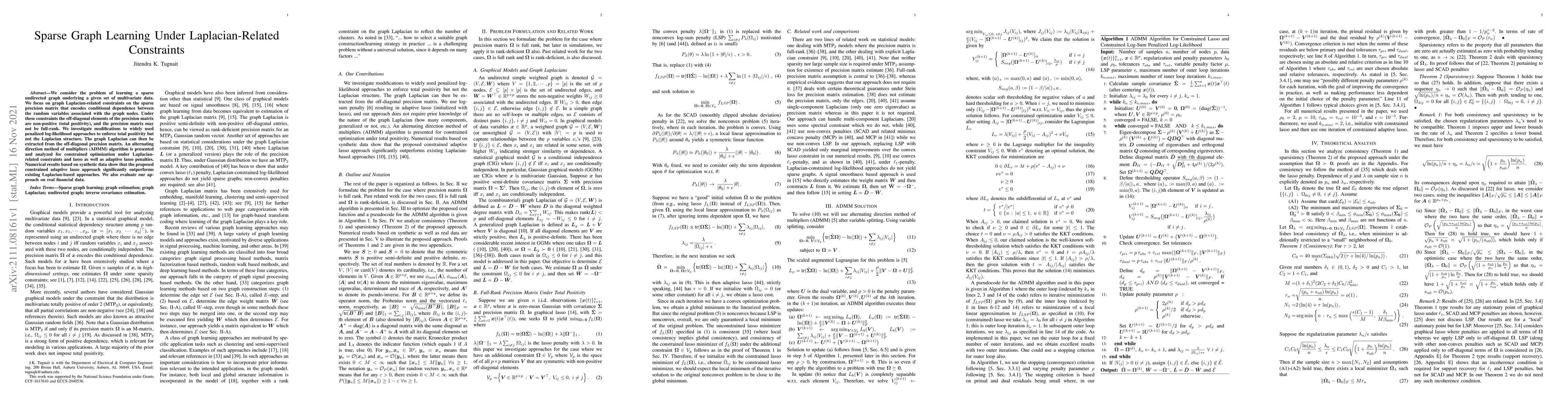 The paper investigates sparse graph learning under Laplacian-related constraints, modifying penalized log-likelihood approaches to enforce total positivity without enforcing Laplacian structure. An alternating direction method of multipliers (ADMM) algorithm is presented for constrained optimization.