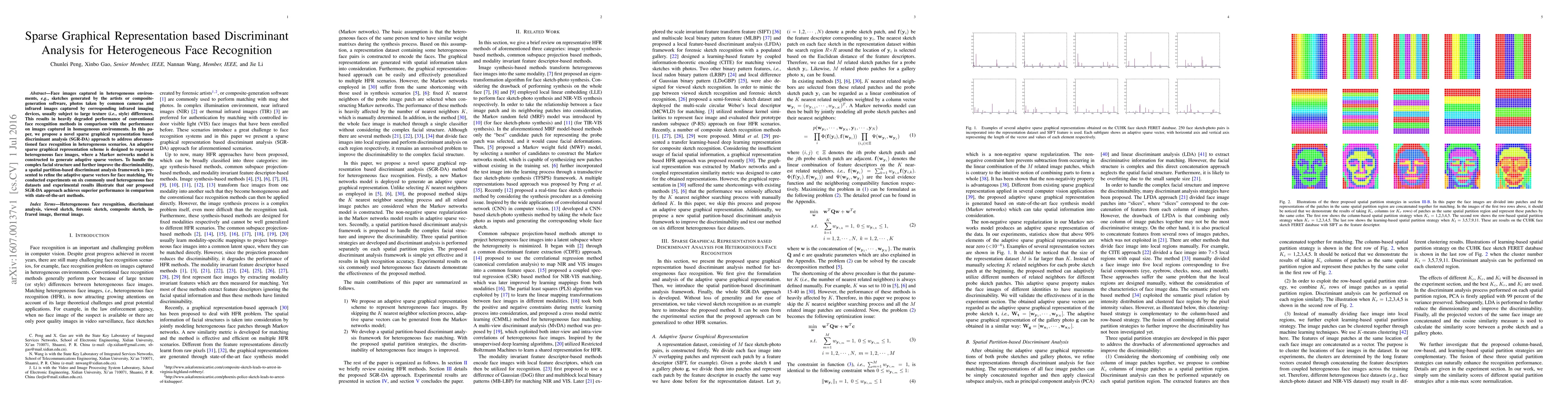 This paper proposes a novel sparse graphical representation based discriminant analysis (SGR-DA) approach for heterogeneous face recognition, addressing large texture differences in diverse environments. The method uses adaptive sparse graphical representation and spatial partition-based discriminant analysis to enhance discriminability, achieving superior performance over state-of-the-art methods in experiments.