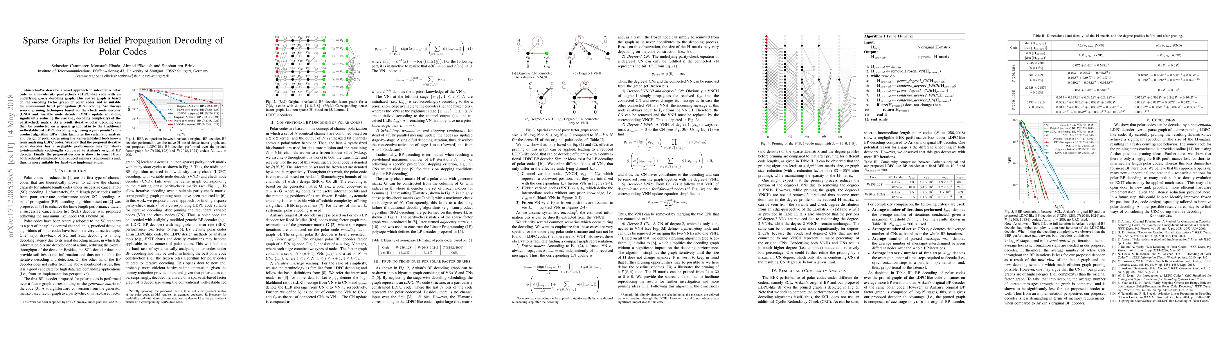 We describe a novel approach to interpret a polar code as a low-density parity-check (LDPC)-like code with an underlying sparse decoding graph. This sparse graph is based on the encoding factor graph of polar codes and is suitable for conventional belief propagation (BP) decoding. We discuss several pruning techniques based on the check node decoder (CND) and variable node decoder (VND) update equations, significantly reducing the size (i.e., decoding complexity) of the parity-check matrix. As a result, iterative polar decoding can then be conducted on a sparse graph, akin to the traditional well-established LDPC decoding, e.g., using a fully parallel sum-product algorithm (SPA). This facilitates the systematic analysis and design of polar codes using the well-established tools known from analyzing LDPC codes. We show that the proposed iterative polar decoder has a negligible performance loss for short-to-intermediate codelengths compared to Arikan's original BP decoder. Finally, the proposed decoder is shown to benefit from both reduced complexity and reduced memory requirements and, thus, is more suitable for hardware implementations.