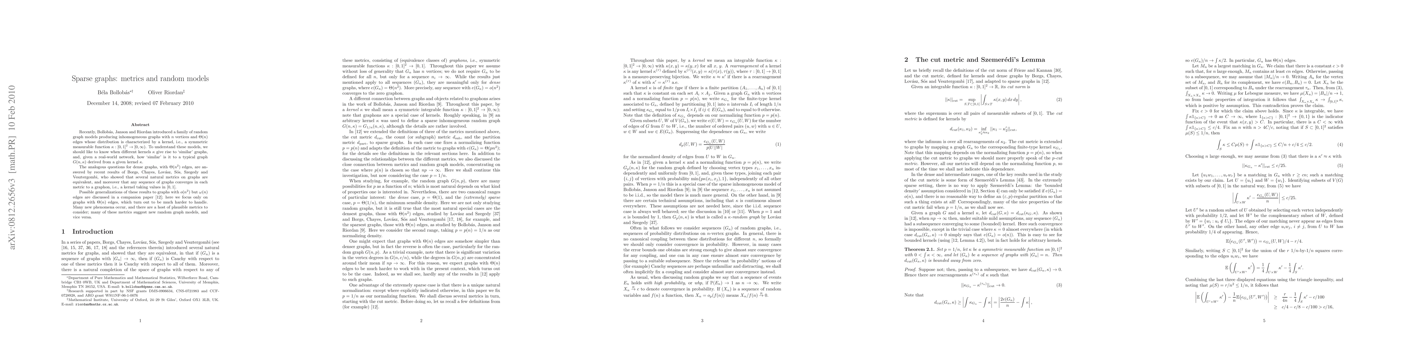 Recently, Bollob\'as, Janson and Riordan introduced a family of random graph models producing inhomogeneous graphs with $n$ vertices and $\Theta(n)$ edges whose distribution is characterized by a kernel, i.e., a symmetric measurable function $\ka:[0,1]^2 \to [0,\infty)$. To understand these models, we should like to know when different kernels $\ka$ give rise to `similar' graphs, and, given a real-world network, how `similar' is it to a typical graph $G(n,\ka)$ derived from a given kernel $\ka$. The analogous questions for dense graphs, with $\Theta(n^2)$ edges, are answered by recent results of Borgs, Chayes, Lov\'asz, S\'os, Szegedy and Vesztergombi, who showed that several natural metrics on graphs are equivalent, and moreover that any sequence of graphs converges in each metric to a graphon, i.e., a kernel taking values in $[0,1]$. Possible generalizations of these results to graphs with $o(n^2)$ but $\omega(n)$ edges are discussed in a companion paper [arXiv:0708.1919]; here we focus only on graphs with $\Theta(n)$ edges, which turn out to be much harder to handle. Many new phenomena occur, and there are a host of plausible metrics to consider; many of these metrics suggest new random graph models, and vice versa.