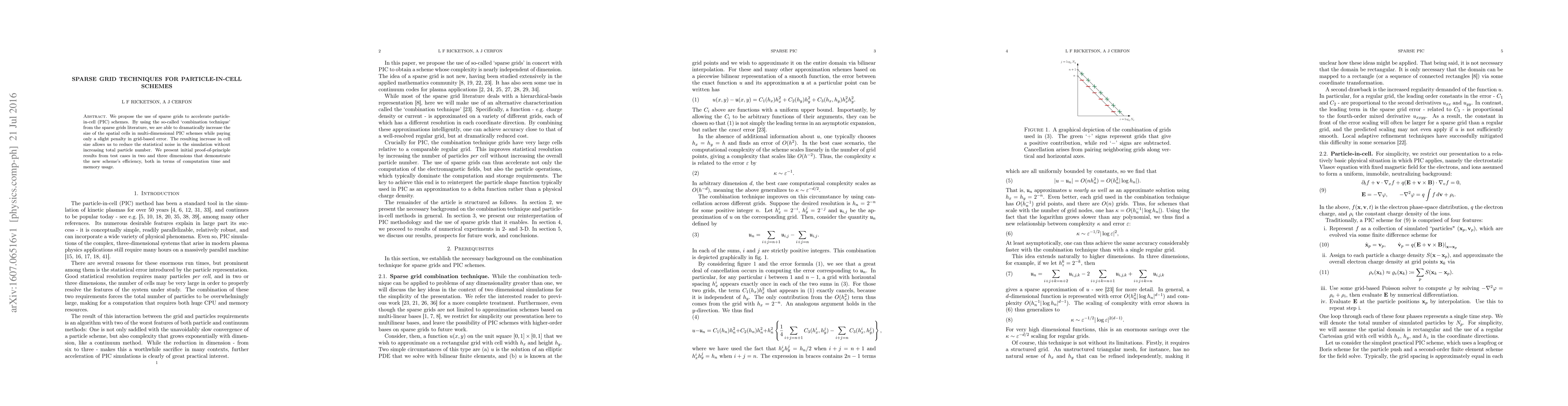 This paper proposes using sparse grids to enhance particle-in-cell (PIC) schemes, significantly increasing spatial cell size with minimal grid-based error, thus reducing simulation noise without raising particle count. Initial results show improved efficiency in computation time and memory usage.