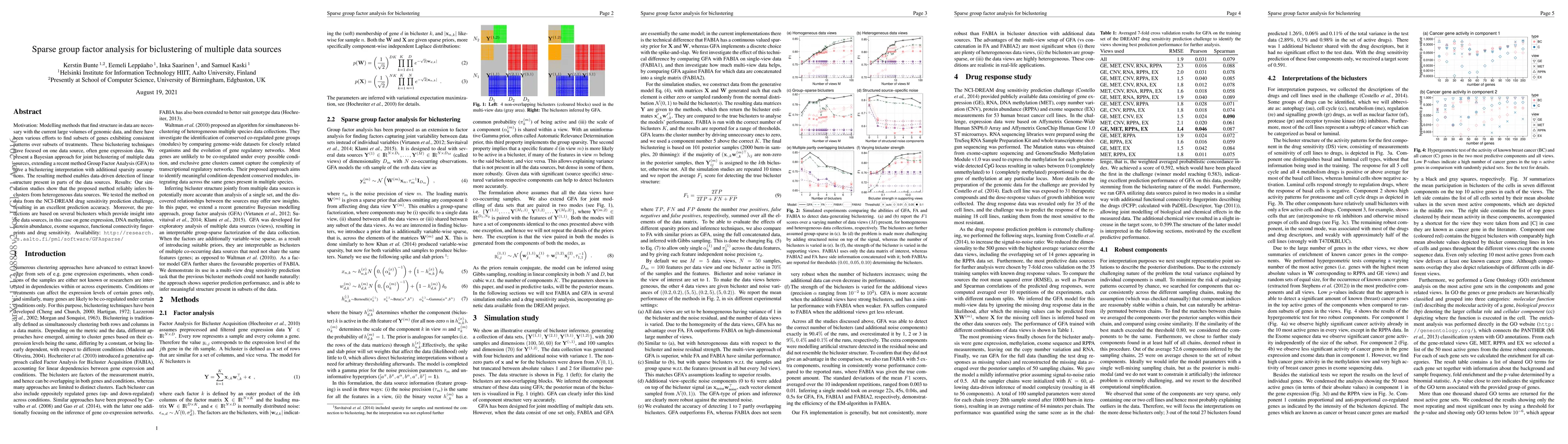 This paper proposes a Bayesian sparse group factor analysis method for joint biclustering across multiple data sources, extending Group Factor Analysis for biclustering interpretation. The method effectively detects linear structures in parts of heterogeneous data, as demonstrated by accurate predictions and insights from the NCI-DREAM drug sensitivity challenge.