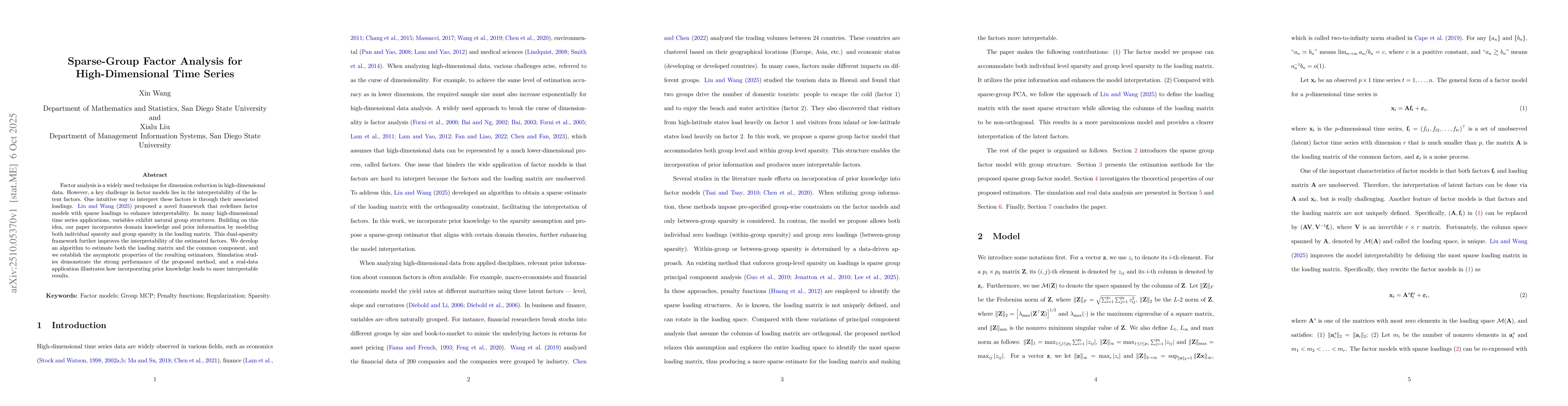 The technical contribution lies in the development of a sparse-group regularization framework that simultaneously enforces both group sparsity and individual element sparsity in factor loading matrices, enhancing model interpretability and estimation accuracy.