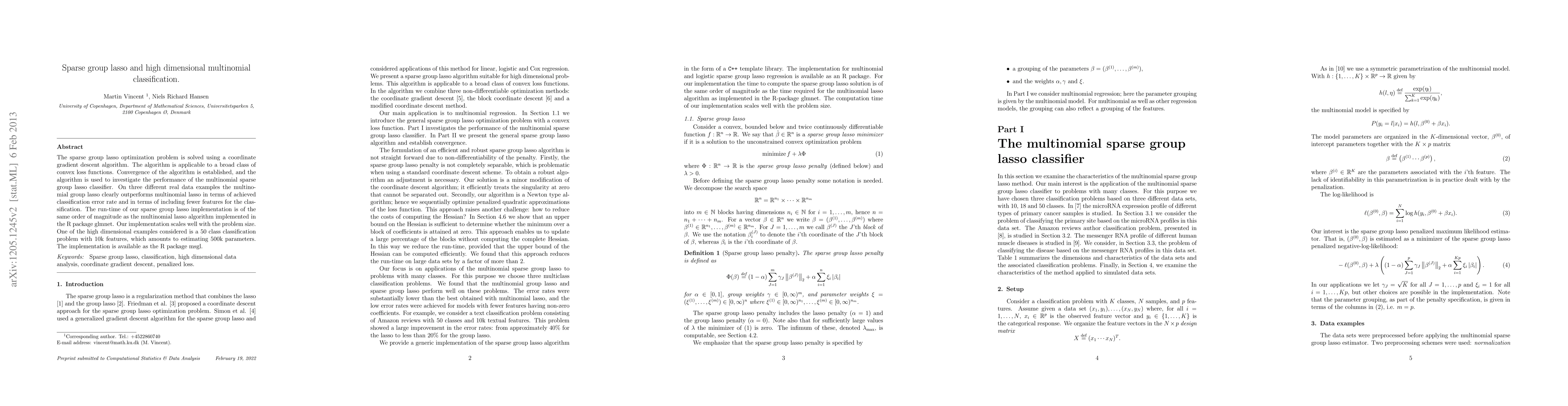 This paper proposes a sparse group lasso algorithm using coordinate gradient descent for high-dimensional multinomial classification, demonstrating superior performance over multinomial lasso in terms of classification error and feature selection. The method scales well and is implemented in the R package msgl.