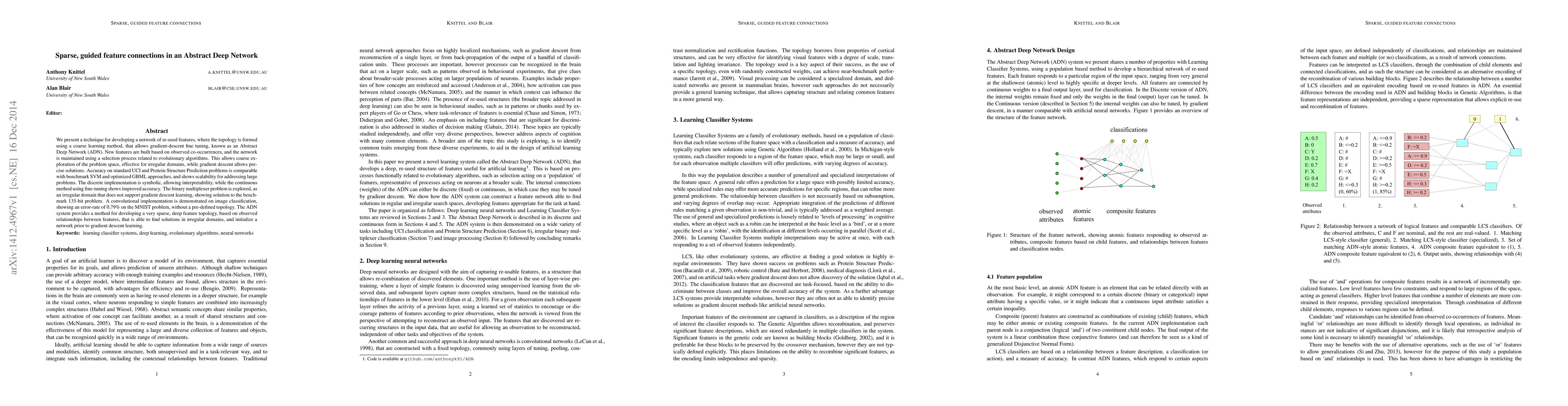 We present a technique for developing a network of re-used features, where the topology is formed using a coarse learning method, that allows gradient-descent fine tuning, known as an Abstract Deep Network (ADN). New features are built based on observed co-occurrences, and the network is maintained using a selection process related to evolutionary algorithms. This allows coarse ex- ploration of the problem space, effective for irregular domains, while gradient descent allows pre- cise solutions. Accuracy on standard UCI and Protein-Structure Prediction problems is comparable with benchmark SVM and optimized GBML approaches, and shows scalability for addressing large problems. The discrete implementation is symbolic, allowing interpretability, while the continuous method using fine-tuning shows improved accuracy. The binary multiplexer problem is explored, as an irregular domain that does not support gradient descent learning, showing solution to the bench- mark 135-bit problem. A convolutional implementation is demonstrated on image classification, showing an error-rate of 0.79% on the MNIST problem, without a pre-defined topology. The ADN system provides a method for developing a very sparse, deep feature topology, based on observed relationships between features, that is able to find solutions in irregular domains, and initialize a network prior to gradient descent learning.