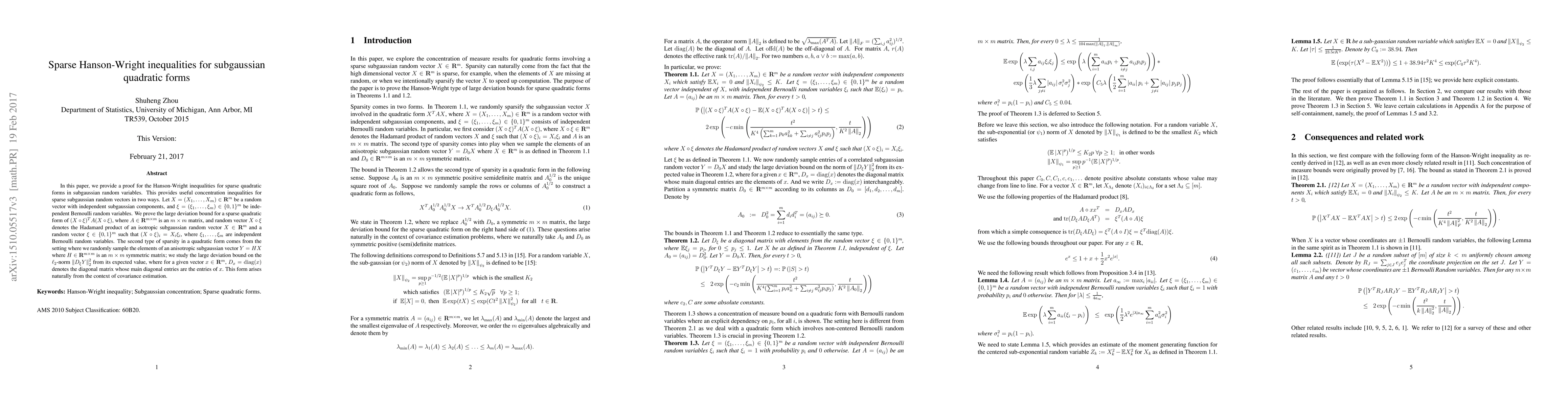This paper proves Hanson-Wright inequalities for quadratic forms involving sparse subgaussian random vectors. It provides concentration bounds for both sparse subgaussian random vectors formed by Hadamard products and those obtained through random sampling of anisotropic subgaussian vectors, which is relevant for covariance estimation.