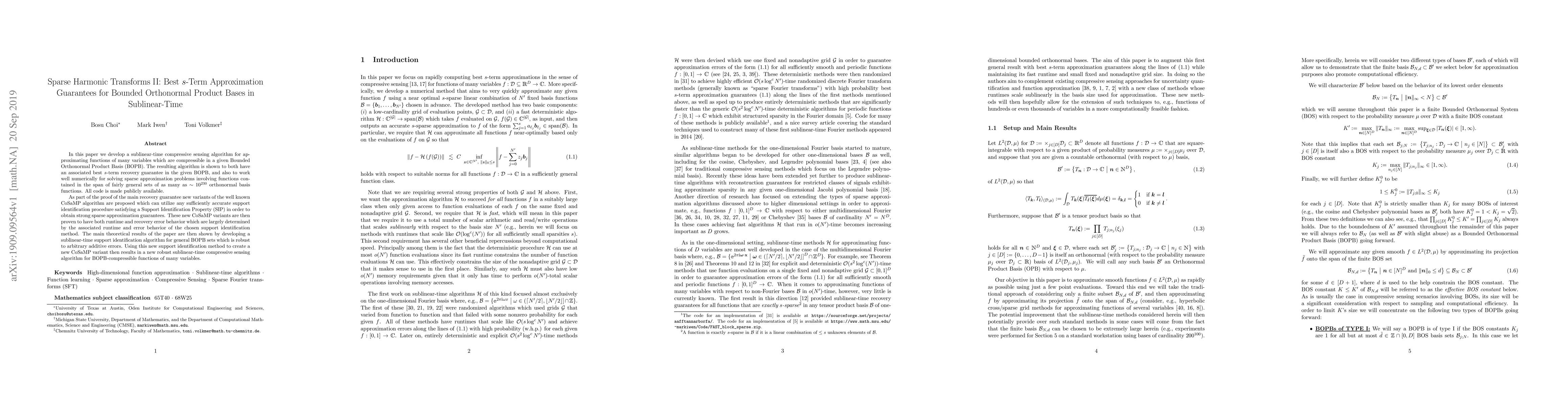 In this paper, we develop a sublinear-time compressive sensing algorithm for approximating functions of many variables which are compressible in a given Bounded Orthonormal Product Basis (BOPB). The resulting algorithm is shown to both have an associated best $s$-term recovery guarantee in the given BOPB, and also to work well numerically for solving sparse approximation problems involving functions contained in the span of fairly general sets of as many as $\sim10^{230}$ orthonormal basis functions. All code is made publicly available. As part of the proof of the main recovery guarantee new variants of the well known CoSaMP algorithm are proposed which can utilize any sufficiently accurate support identification procedure satisfying a {Support Identification Property (SIP)} in order to obtain strong sparse approximation guarantees. These new CoSaMP variants are then proven to have both runtime and recovery error behavior which are largely determined by the associated runtime and error behavior of the chosen support identification method. The main theoretical results of the paper are then shown by developing a sublinear-time support identification algorithm for general BOPB sets which is robust to arbitrary additive errors. Using this new support identification method to create a new CoSaMP variant then results in a new robust sublinear-time compressive sensing algorithm for BOPB-compressible functions of many variables.