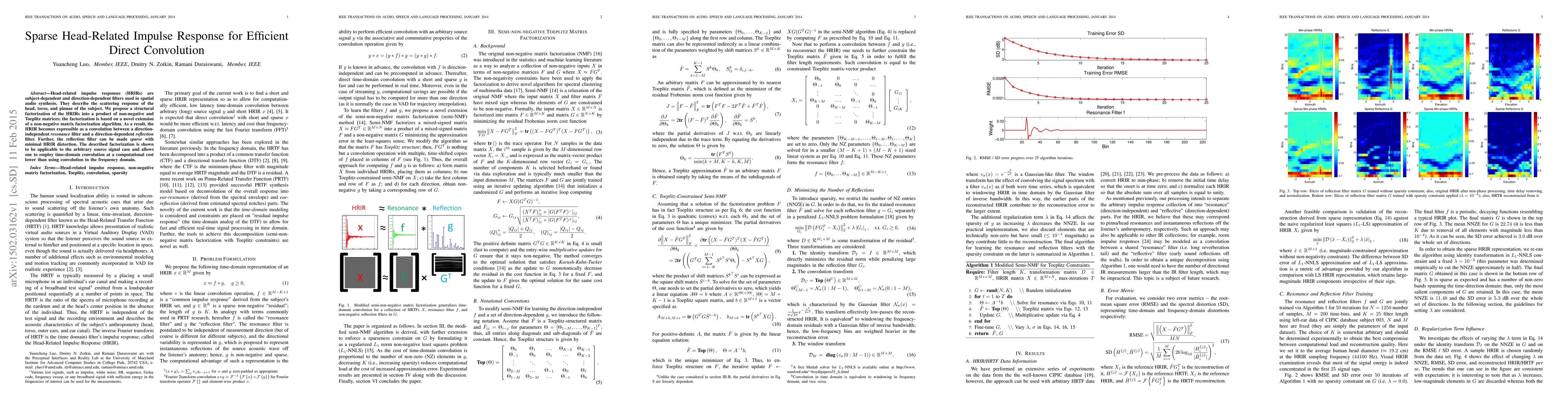 Head-related impulse responses (HRIRs) are subject-dependent and direction-dependent filters used in spatial audio synthesis. They describe the scattering response of the head, torso, and pinnae of the subject. We propose a structural factorization of the HRIRs into a product of non-negative and Toeplitz matrices; the factorization is based on a novel extension of a non-negative matrix factorization algorithm. As a result, the HRIR becomes expressible as a convolution between a direction-independent \emph{resonance} filter and a direction-dependent \emph{reflection} filter. Further, the reflection filter can be made \emph{sparse} with minimal HRIR distortion. The described factorization is shown to be applicable to the arbitrary source signal case and allows one to employ time-domain convolution at a computational cost lower than using convolution in the frequency domain.