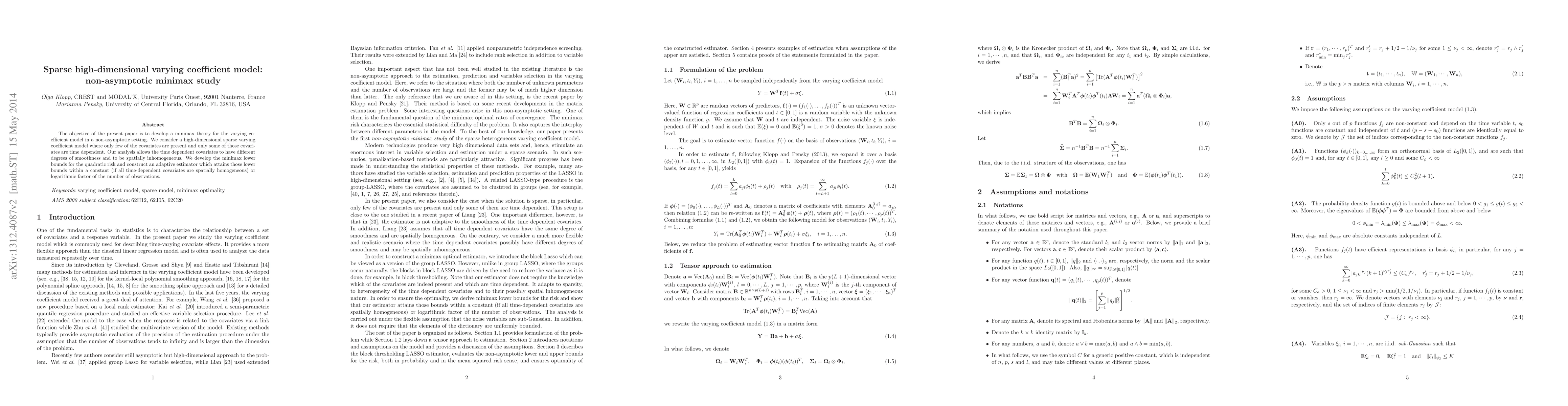 This paper develops a minimax theory for a high-dimensional varying coefficient model with sparse and time-dependent covariates, establishing bounds on the quadratic risk and an adaptive estimator that achieves these bounds within a logarithmic factor of observations.