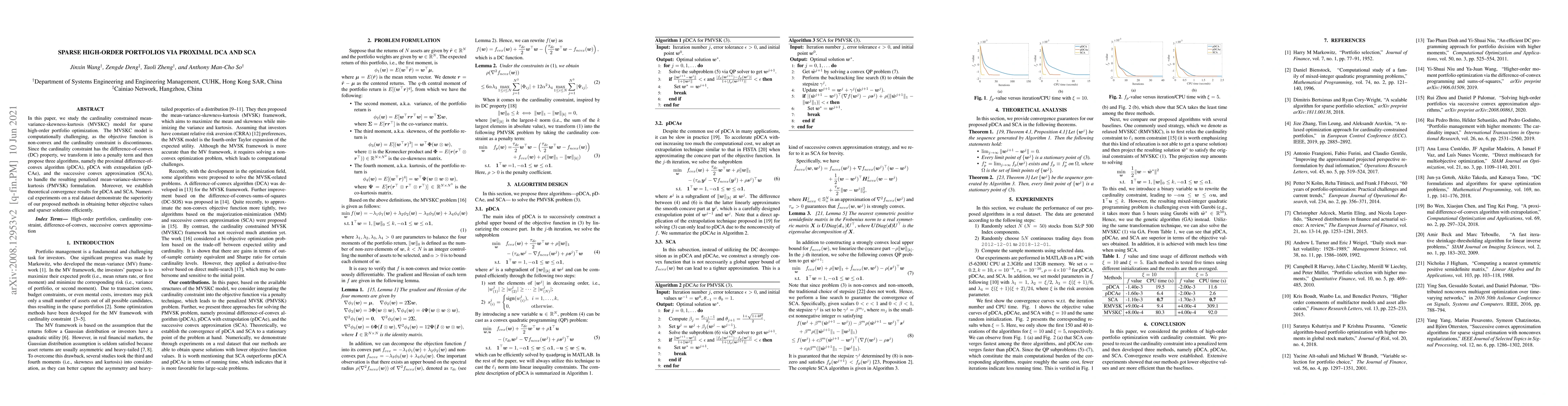 In this paper, we aim at solving the cardinality constrained high-order portfolio optimization, i.e., mean-variance-skewness-kurtosis model with cardinality constraint (MVSKC). Optimization for the MVSKC model is of great difficulty in two parts. One is that the objective function is non-convex, the other is the combinational nature of the cardinality constraint, leading to non-convexity as well dis-continuity. Based on the observation that cardinality constraint has the difference-of-convex (DC) property, we transform the cardinality constraint into a penalty term and then propose three algorithms including the proximal difference of convex algorithm (pDCA), pDCA with extrapolation (pDCAe) and the successive convex approximation (SCA) to handle the resulting penalized MVSK (PMVSK) formulation. Moreover, theoretical convergence results of these algorithms are established respectively. Numerical experiments on the real datasets demonstrate the superiority of our proposed methods in obtaining high utility and sparse solutions as well as efficiency in terms of time usage.
