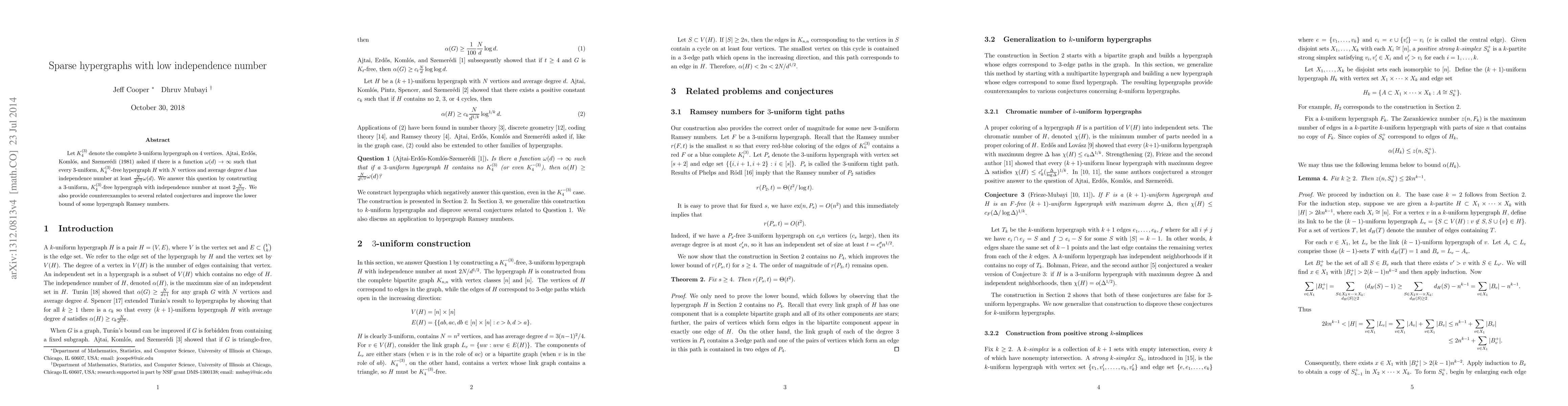 Researchers constructed a 3-uniform hypergraph with independence number at most 2N/d^{1/2}, answering a question about the existence of a function related to the average degree, and providing counterexamples to several conjectures.