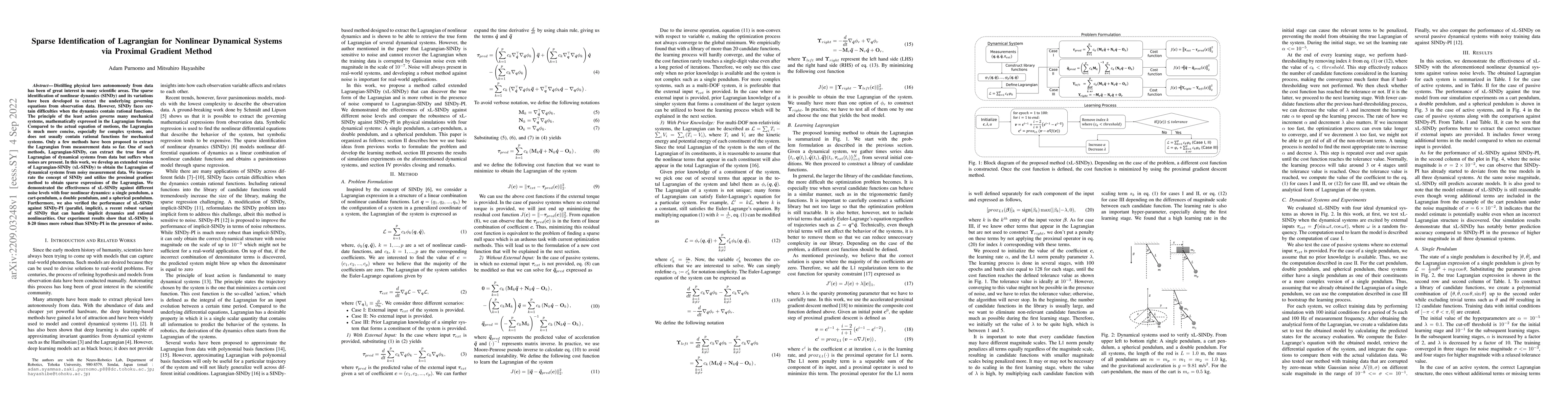This paper proposes an extended version of Lagrangian-SINDy (xL-SINDy) that uses the proximal gradient method to identify sparse Lagrangians for nonlinear dynamical systems from noisy data. Experiments on four nonlinear systems show that xL-SINDy is 8-20 times more robust to noise compared to SINDy-PI.