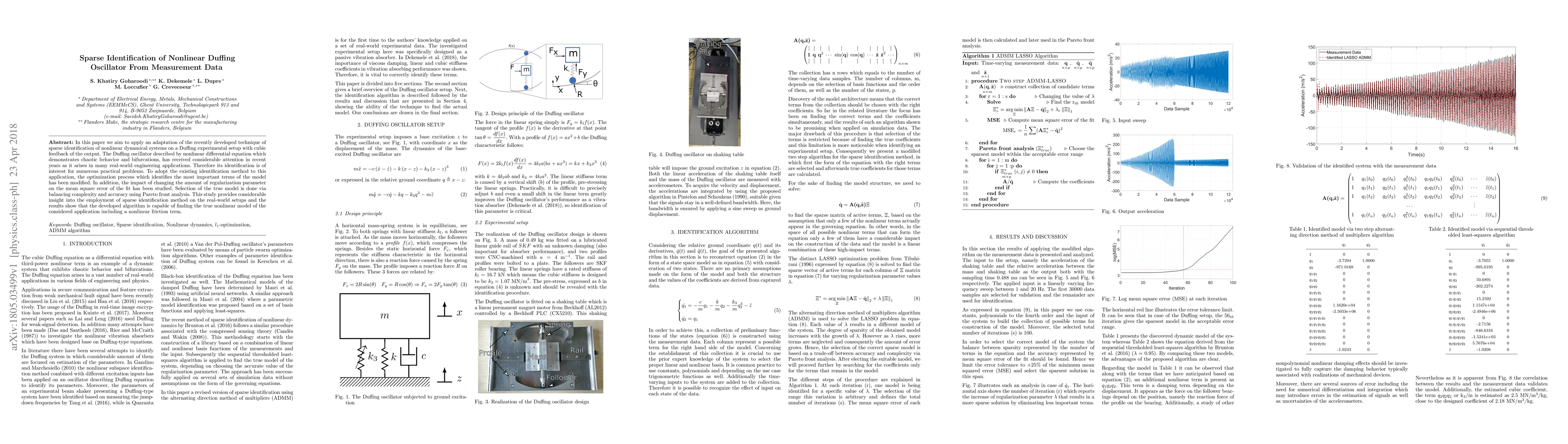This paper applies a modified sparse identification technique to a Duffing oscillator with cubic feedback to identify its nonlinear model from experimental data, demonstrating the method's effectiveness in capturing chaotic behavior and bifurcations, and evaluating the impact of regularization on model accuracy.