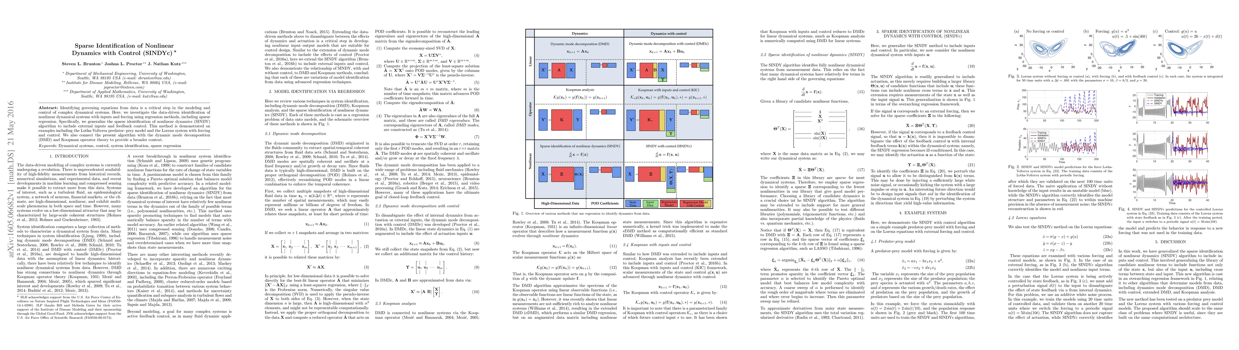 This paper presents SINDYc, a data-driven method for identifying the governing equations of nonlinear dynamical systems with inputs and control, extending the SINDY algorithm. The method is demonstrated on the Lotka-Volterra model and Lorenz system, and its connections to DMD and Koopman operator theory are explored.