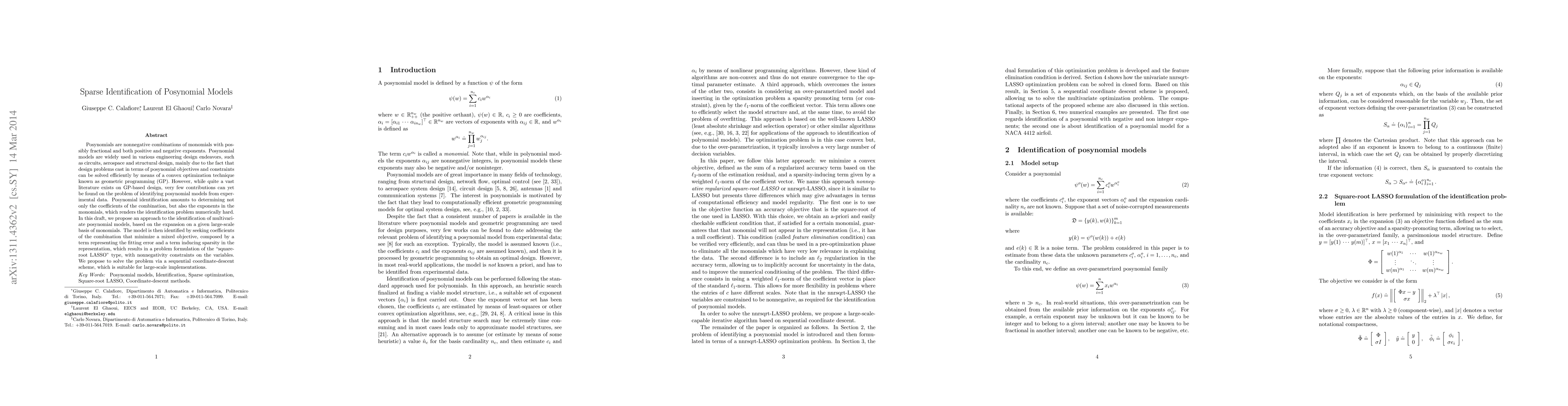 This paper proposes a method for identifying sparse multivariate posynomial models from experimental data by minimizing a mixed objective that balances fitting error and sparsity. The approach uses a sequential coordinate-descent scheme to solve the resulting "square-root LASSO" optimization problem with nonnegativity constraints.
