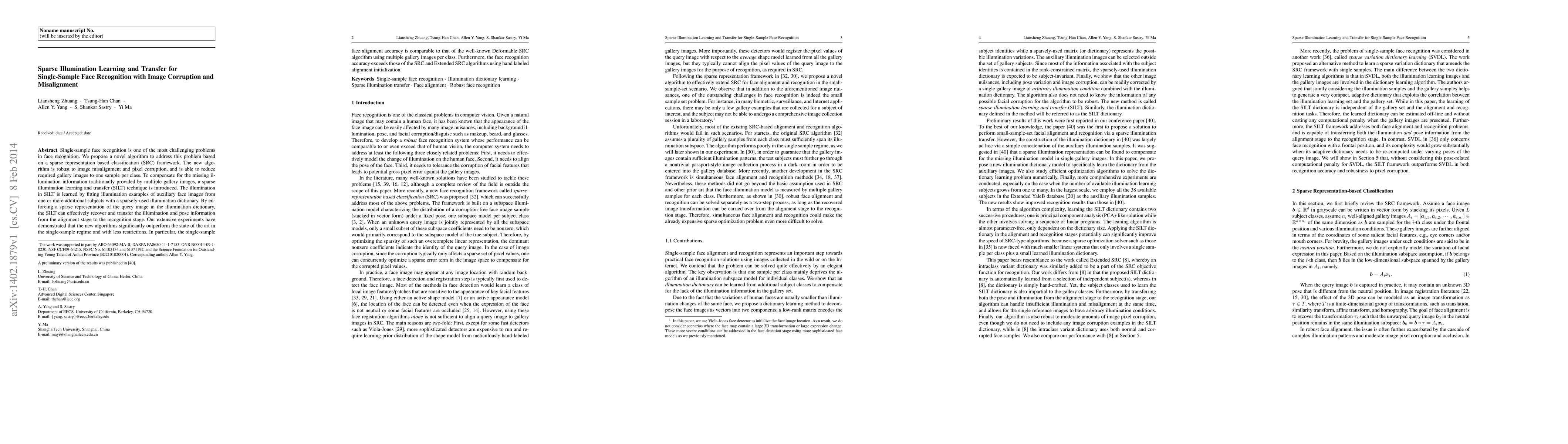 This paper proposes a novel sparse representation-based algorithm for single-sample face recognition that is robust to image misalignment and corruption. It introduces a sparse illumination learning and transfer technique to compensate for the lack of multiple gallery images, significantly outperforming existing methods in accuracy.