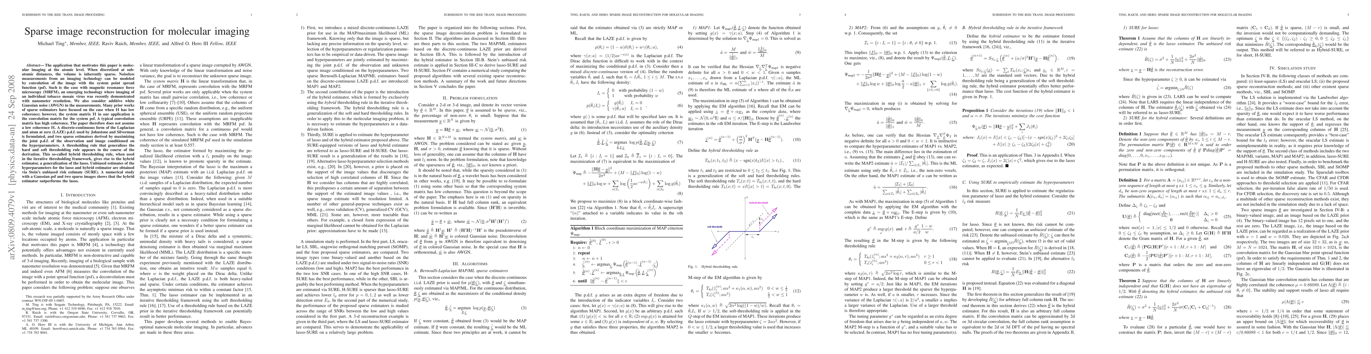 The application that motivates this paper is molecular imaging at the atomic level. When discretized at sub-atomic distances, the volume is inherently sparse. Noiseless measurements from an imaging technology can be modeled by convolution of the image with the system point spread function (psf). Such is the case with magnetic resonance force microscopy (MRFM), an emerging technology where imaging of an individual tobacco mosaic virus was recently demonstrated with nanometer resolution. We also consider additive white Gaussian noise (AWGN) in the measurements. Many prior works of sparse estimators have focused on the case when H has low coherence; however, the system matrix H in our application is the convolution matrix for the system psf. A typical convolution matrix has high coherence. The paper therefore does not assume a low coherence H. A discrete-continuous form of the Laplacian and atom at zero (LAZE) p.d.f. used by Johnstone and Silverman is formulated, and two sparse estimators derived by maximizing the joint p.d.f. of the observation and image conditioned on the hyperparameters. A thresholding rule that generalizes the hard and soft thresholding rule appears in the course of the derivation. This so-called hybrid thresholding rule, when used in the iterative thresholding framework, gives rise to the hybrid estimator, a generalization of the lasso. Unbiased estimates of the hyperparameters for the lasso and hybrid estimator are obtained via Stein's unbiased risk estimate (SURE). A numerical study with a Gaussian psf and two sparse images shows that the hybrid estimator outperforms the lasso.