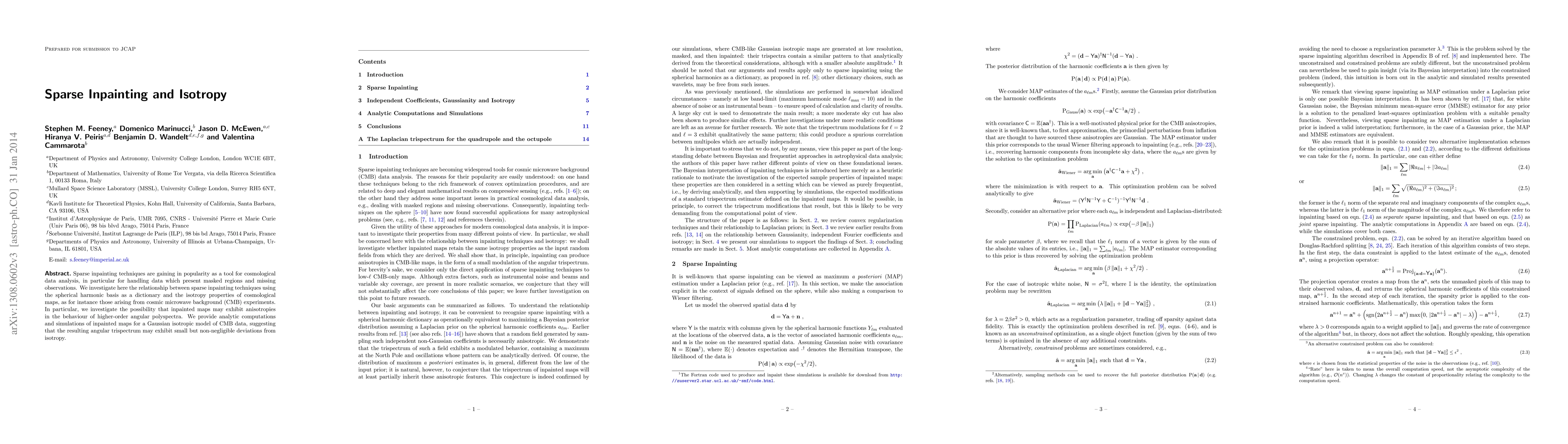 Sparse inpainting techniques are gaining in popularity as a tool for cosmological data analysis, in particular for handling data which present masked regions and missing observations. We investigate here the relationship between sparse inpainting techniques using the spherical harmonic basis as a dictionary and the isotropy properties of cosmological maps, as for instance those arising from cosmic microwave background (CMB) experiments. In particular, we investigate the possibility that inpainted maps may exhibit anisotropies in the behaviour of higher-order angular polyspectra. We provide analytic computations and simulations of inpainted maps for a Gaussian isotropic model of CMB data, suggesting that the resulting angular trispectrum may exhibit small but non-negligible deviations from isotropy.