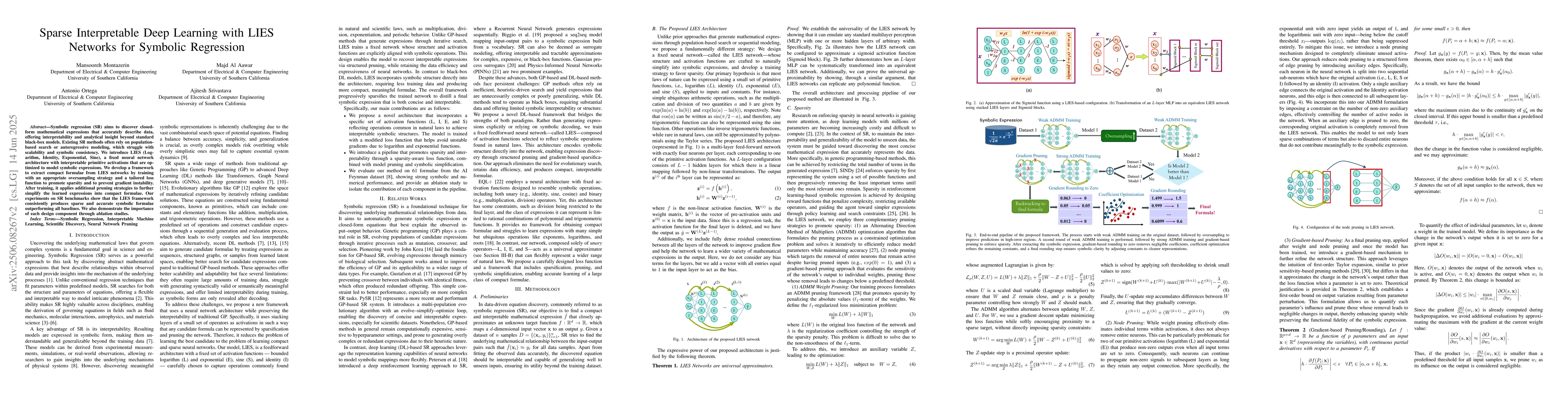A new neural network architecture called LIES is introduced for symbolically regressing data, producing accurate and interpretable mathematical expressions that outperform existing methods. The framework promotes sparsity through oversampling and pruning strategies, leading to consistent results in benchmark experiments.