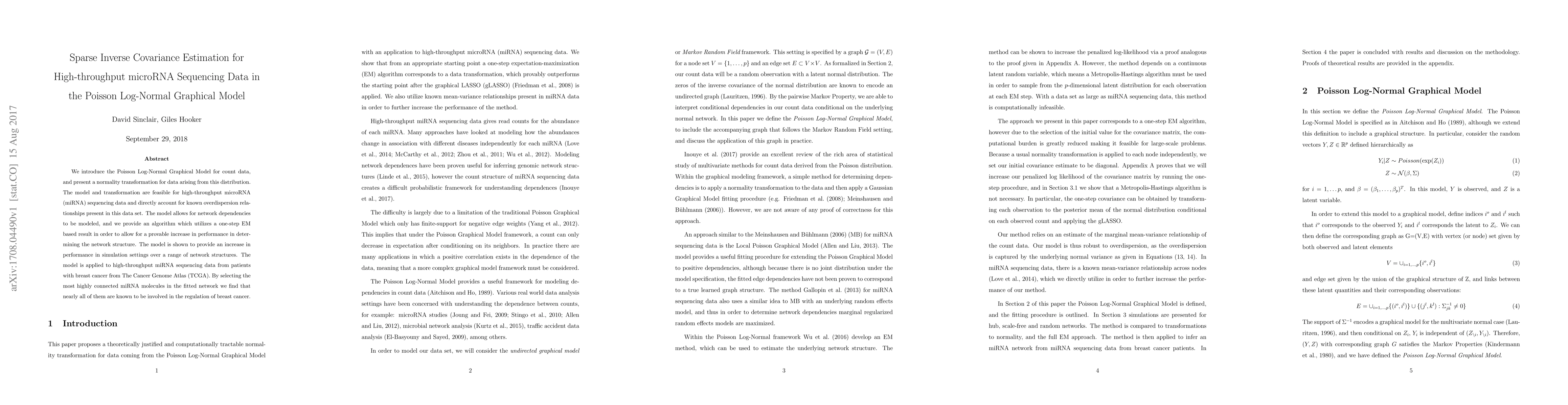We introduce the Poisson Log-Normal Graphical Model for count data, and present a normality transformation for data arising from this distribution. The model and transformation are feasible for high-throughput microRNA (miRNA) sequencing data and directly account for known overdispersion relationships present in this data set. The model allows for network dependencies to be modeled, and we provide an algorithm which utilizes a one-step EM based result in order to allow for a provable increase in performance in determining the network structure. The model is shown to provide an increase in performance in simulation settings over a range of network structures. The model is applied to high-throughput miRNA sequencing data from patients with breast cancer from The Cancer Genome Atlas (TCGA). By selecting the most highly connected miRNA molecules in the fitted network we find that nearly all of them are known to be involved in the regulation of breast cancer.