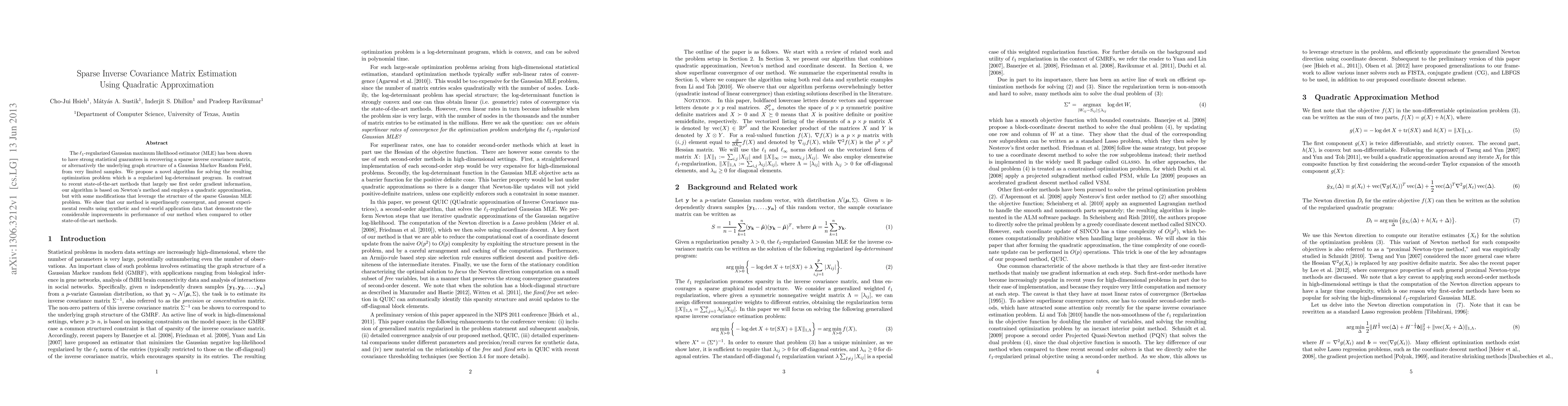 This paper proposes a novel algorithm based on Newton's method and quadratic approximation for sparse inverse covariance matrix estimation, showing superlinear convergence and outperforming state-of-the-art methods in both synthetic and real-world data.