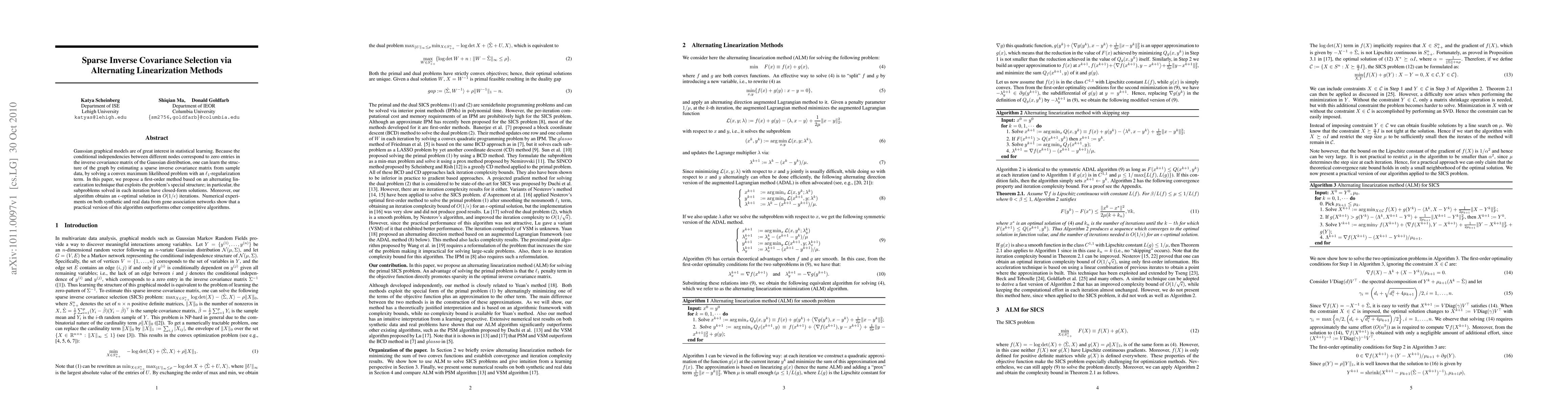 This paper proposes a first-order alternating linearization method for sparse inverse covariance selection in Gaussian graphical models, achieving $\epsilon$-optimal solutions in $O(1/\epsilon)$ iterations with closed-form subproblem solutions. Experiments demonstrate superior performance over other algorithms on synthetic and real gene association networks.