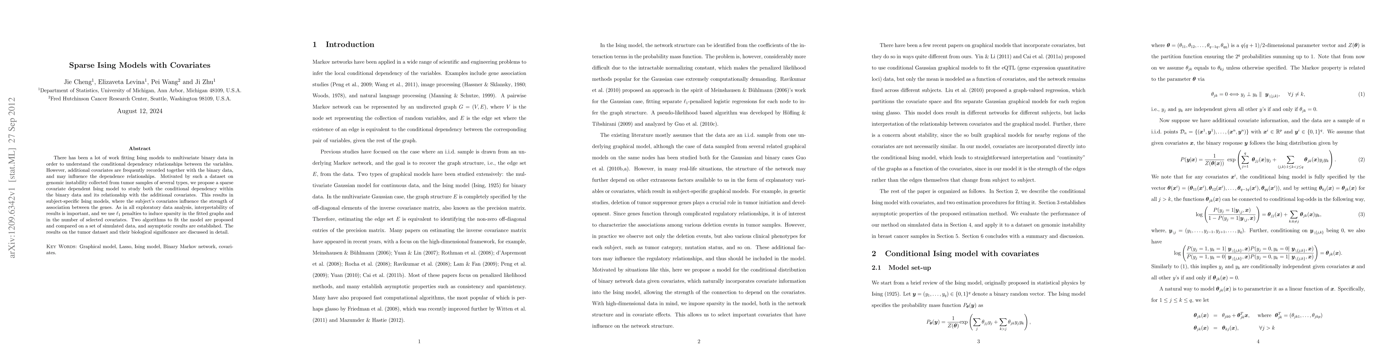 There has been a lot of work fitting Ising models to multivariate binary data in order to understand the conditional dependency relationships between the variables. However, additional covariates are frequently recorded together with the binary data, and may influence the dependence relationships. Motivated by such a dataset on genomic instability collected from tumor samples of several types, we propose a sparse covariate dependent Ising model to study both the conditional dependency within the binary data and its relationship with the additional covariates. This results in subject-specific Ising models, where the subject's covariates influence the strength of association between the genes. As in all exploratory data analysis, interpretability of results is important, and we use L1 penalties to induce sparsity in the fitted graphs and in the number of selected covariates. Two algorithms to fit the model are proposed and compared on a set of simulated data, and asymptotic results are established. The results on the tumor dataset and their biological significance are discussed in detail.