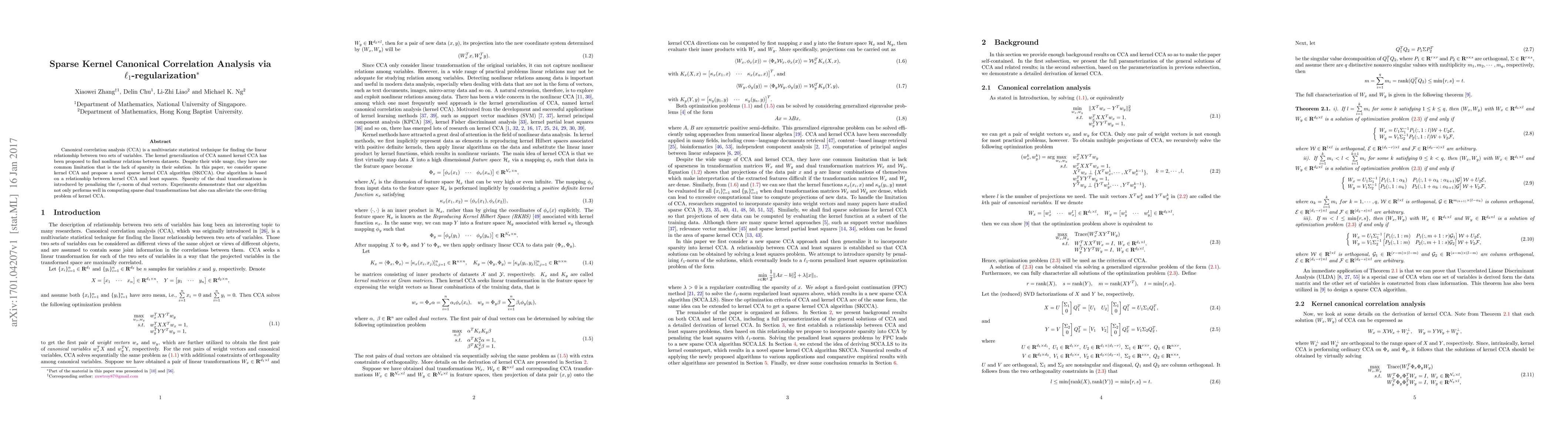 This paper proposes a novel sparse kernel canonical correlation analysis (SKCCA) algorithm that incorporates $\ell_1$-regularization to introduce sparsity in dual transformations, addressing the common lack of sparsity in existing kernel CCA methods. The algorithm effectively mitigates overfitting and performs well in computing sparse solutions.