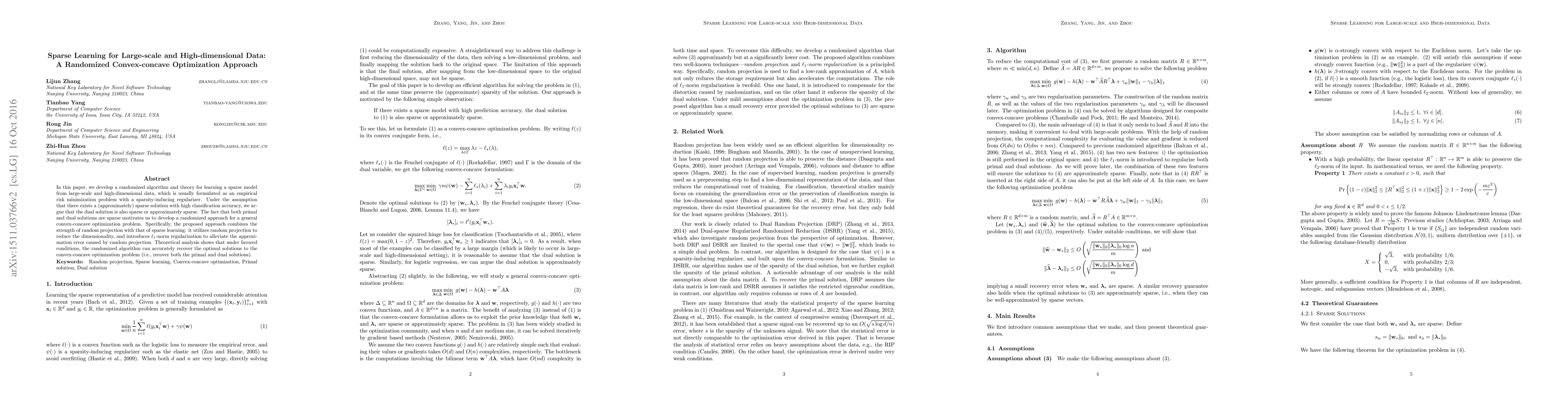 This paper proposes a randomized convex-concave optimization approach to learn sparse models from large-scale and high-dimensional data. It combines random projection for dimensionality reduction and $\ell_1$-norm regularization to minimize approximation errors, theoretically demonstrating the algorithm's ability to recover optimal primal and dual sparse solutions under favorable conditions.