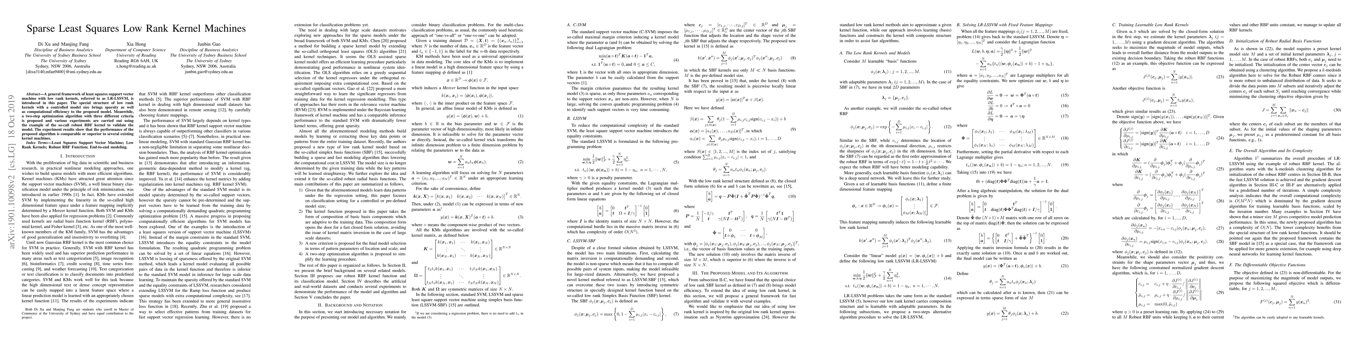 This paper introduces LR-LSSVM, a least squares support vector machine with low rank kernels, which achieves sparsity and computational efficiency. The proposed two-step optimization algorithm is validated through experiments using robust RBF kernels, demonstrating comparable or superior performance to existing kernel machines.